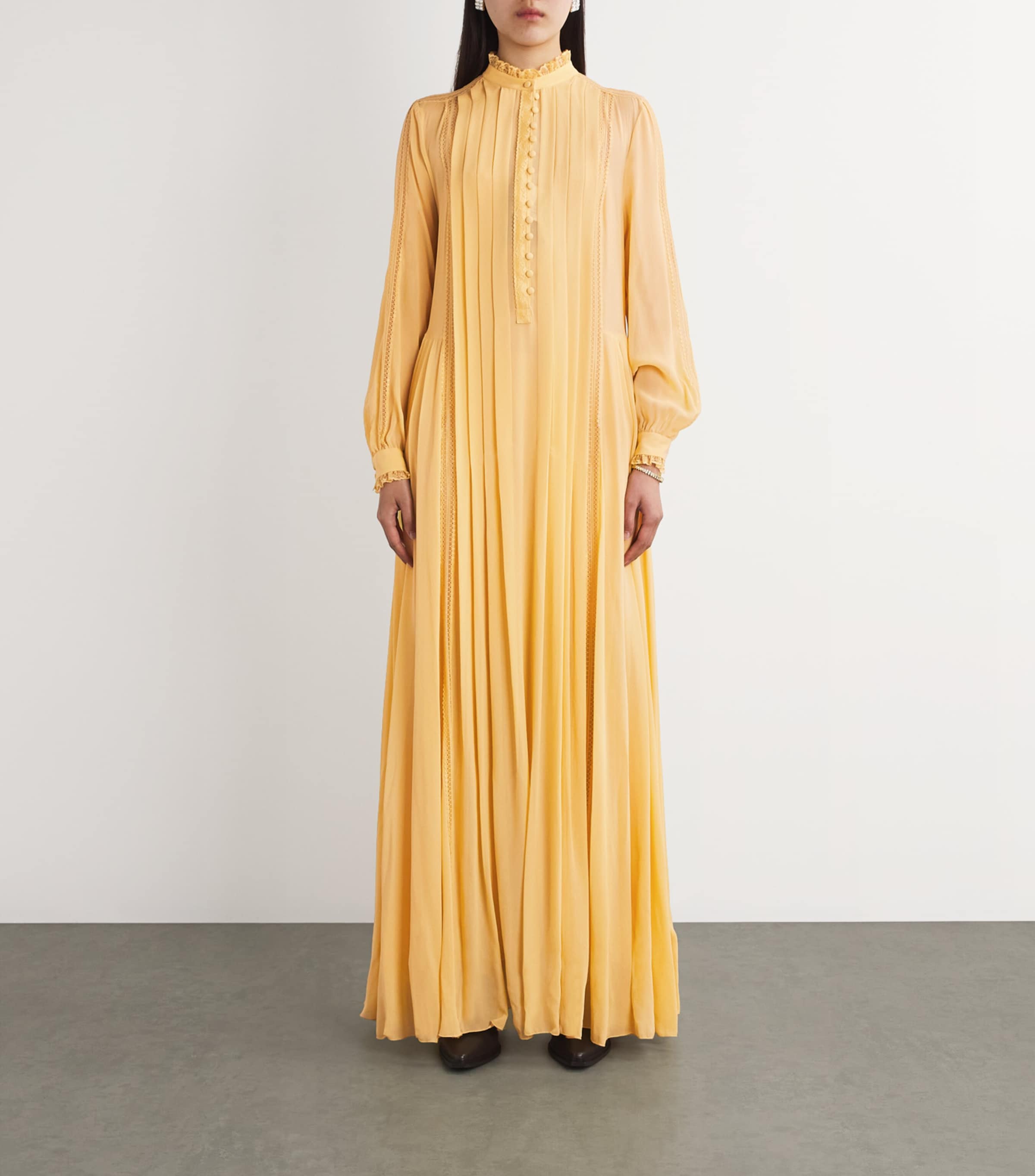 Etro gelbes Seidenkleid mit hohem Kragen und Falten