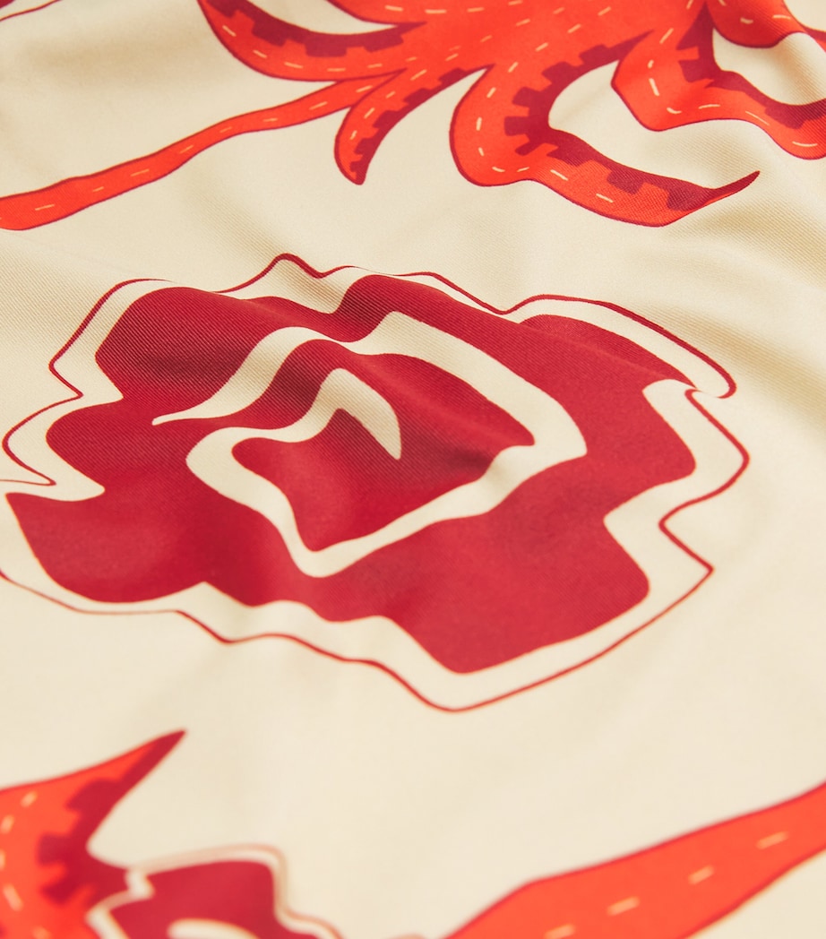 Der Badeanzug von Alta Mar wird teilweise aus recycelten Materialien hergestellt, um zu einer nachhaltigeren Modewirtschaft beizutragen. Dank seines trägerlosen Ausschnitts gehören unschöne Bräunungsstreifen an den Schultern der Vergangenheit an. Er wurde in Kolumbien von Johanna Ortiz entworfen, einem Label, das sich zum Ziel gesetzt hat, das Kunsthandwerk seines Landes bestmöglich zu fördern.