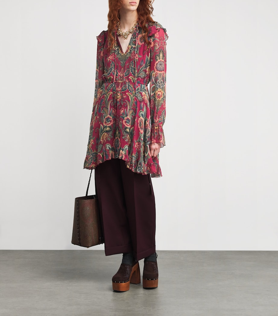 Die Kleider von Etro versprühen in dieser Saison Retro-Charme und sind von den ikonischen Paisley-Mustern der Marke inspiriert. Dieses Minikleid integriert diese Muster in ein romantisches Blumendesign und fängt die Zartheit von Blütenblättern durch seidengefüllte Rüschen ein.