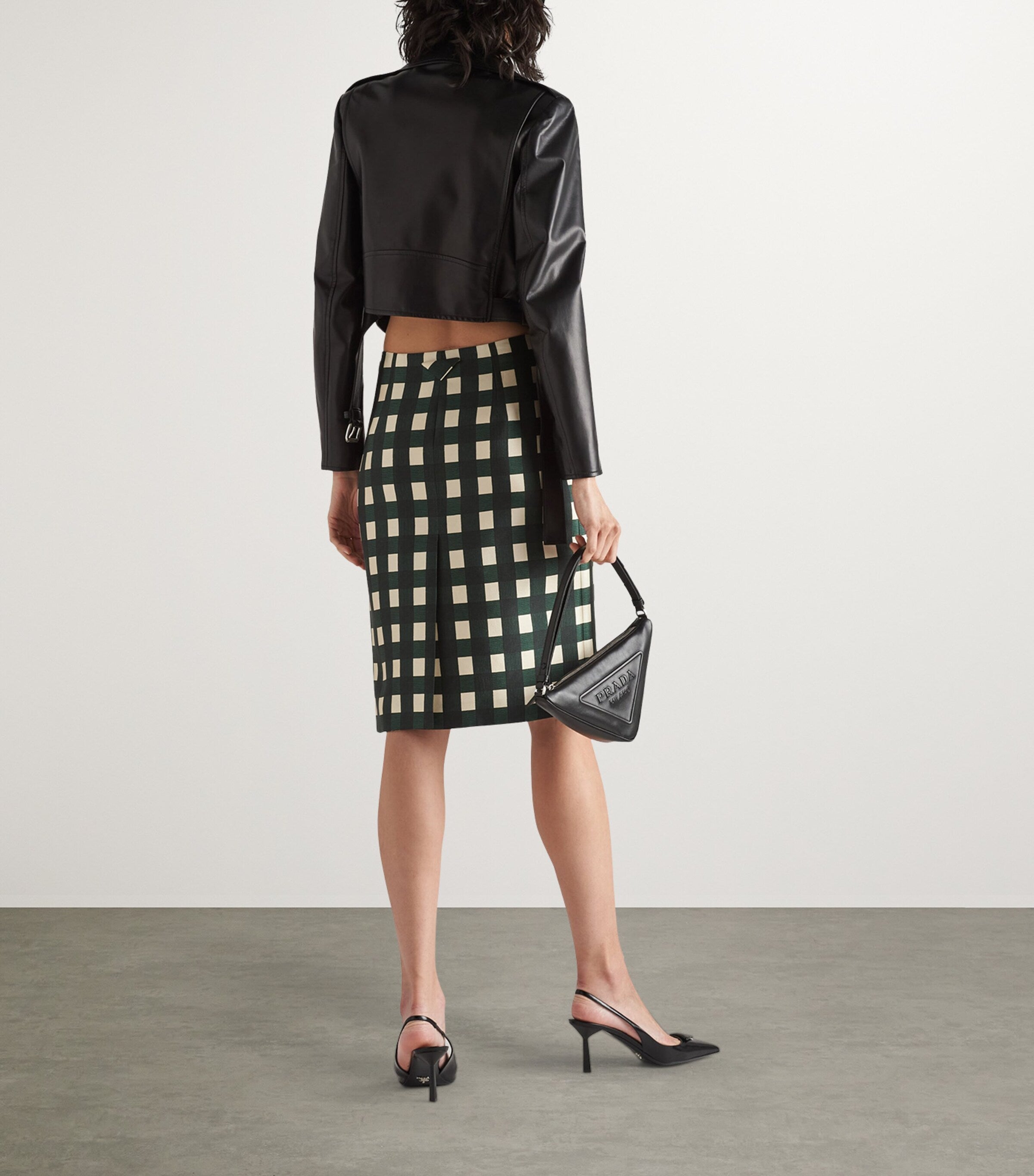 Pradas neueste Lederjacke verspricht eine schmeichelhafte Passform. Der verkürzte Saum wirkt weder zu wuchtig noch verdeckt er die Taille anderer Kleidungsstücke. Die klassische Biker-Silhouette wird durch geschmeidiges Nappaleder und das ikonische dreieckige Logo-Emblem veredelt.