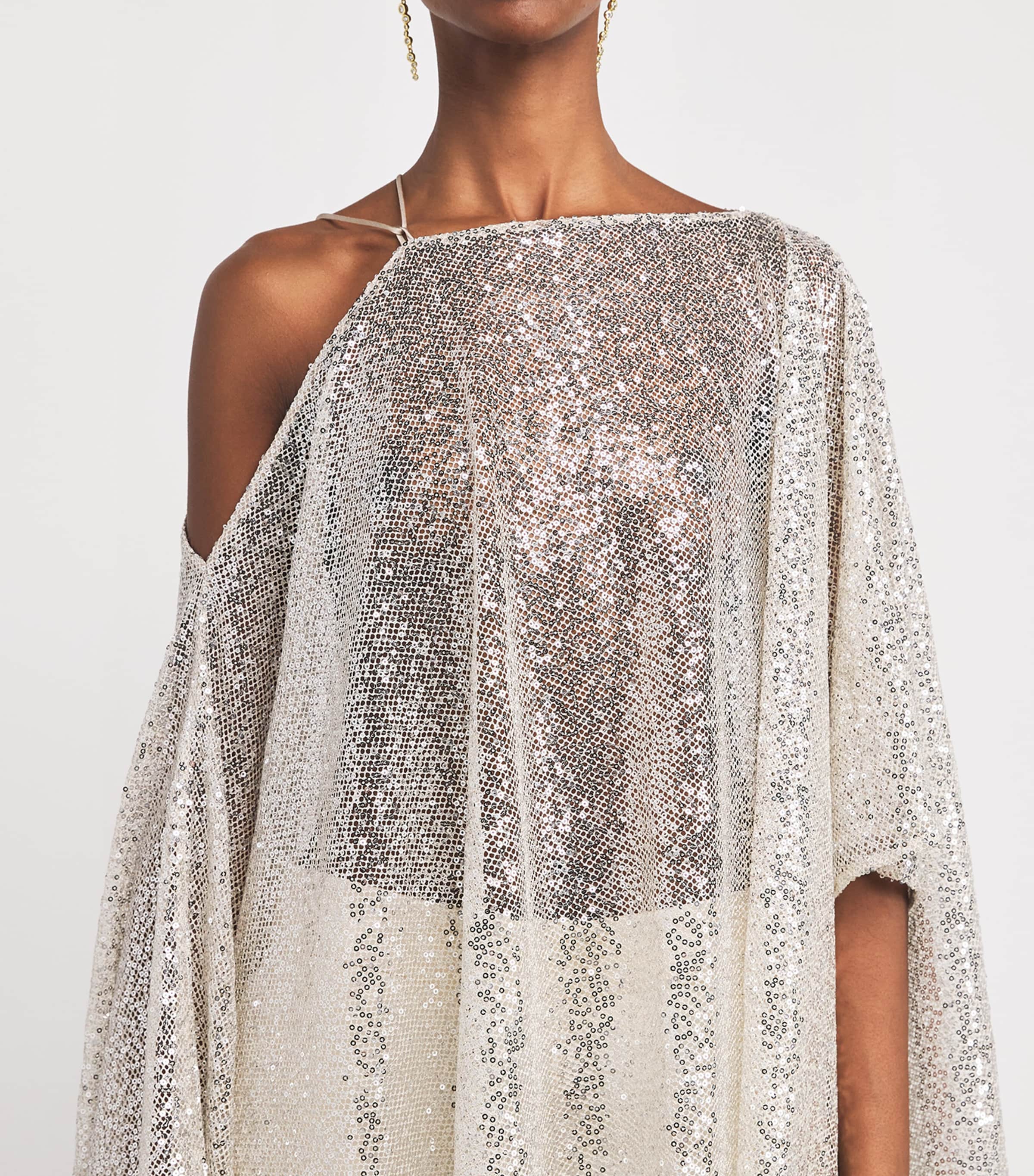 Dank eines raffinierten Schnitts lässt sich dieses halbtransparente Kleidungsstück sowohl als gewagtes Minikleid als auch als fließendes Kaftan-Top tragen.