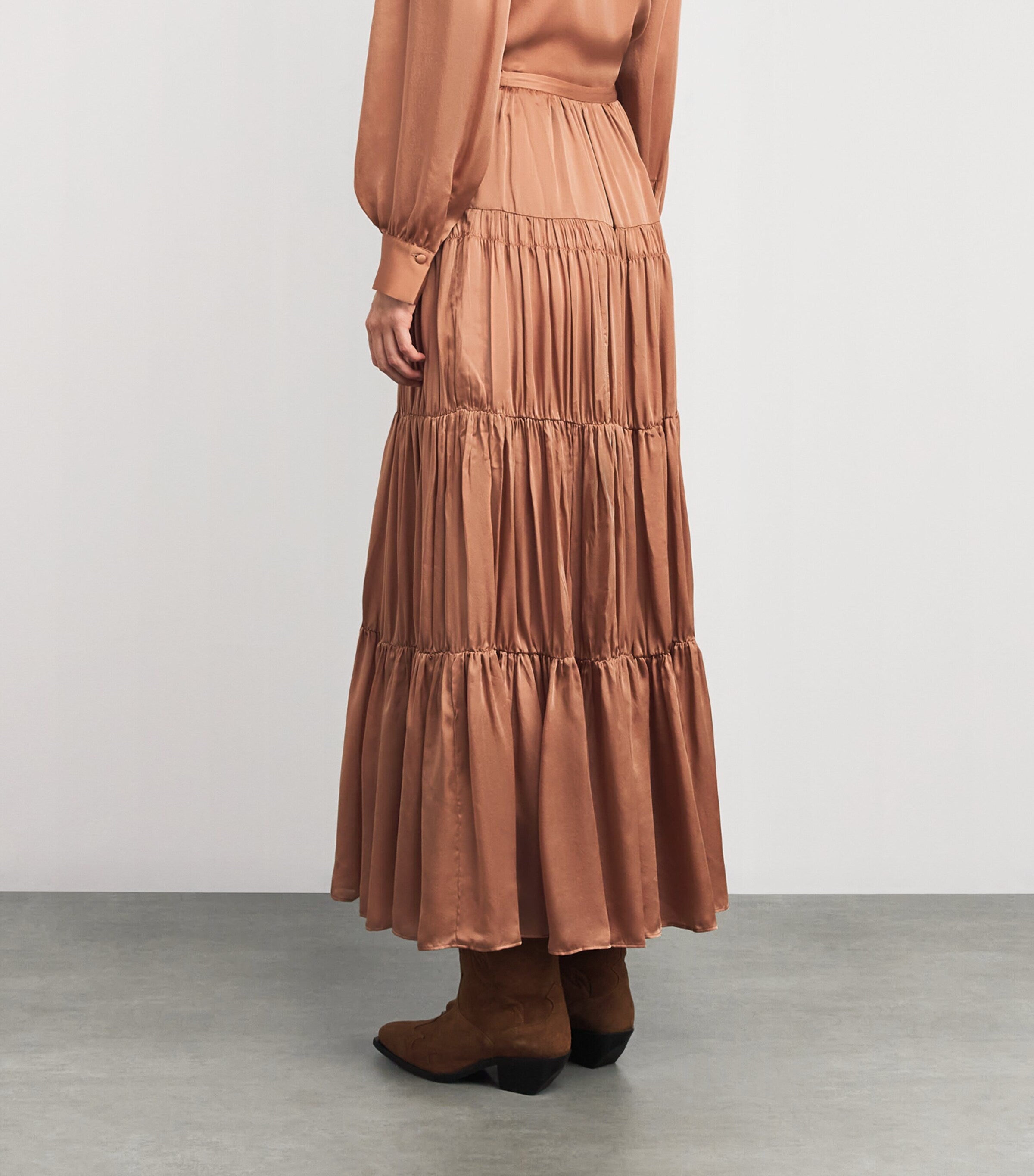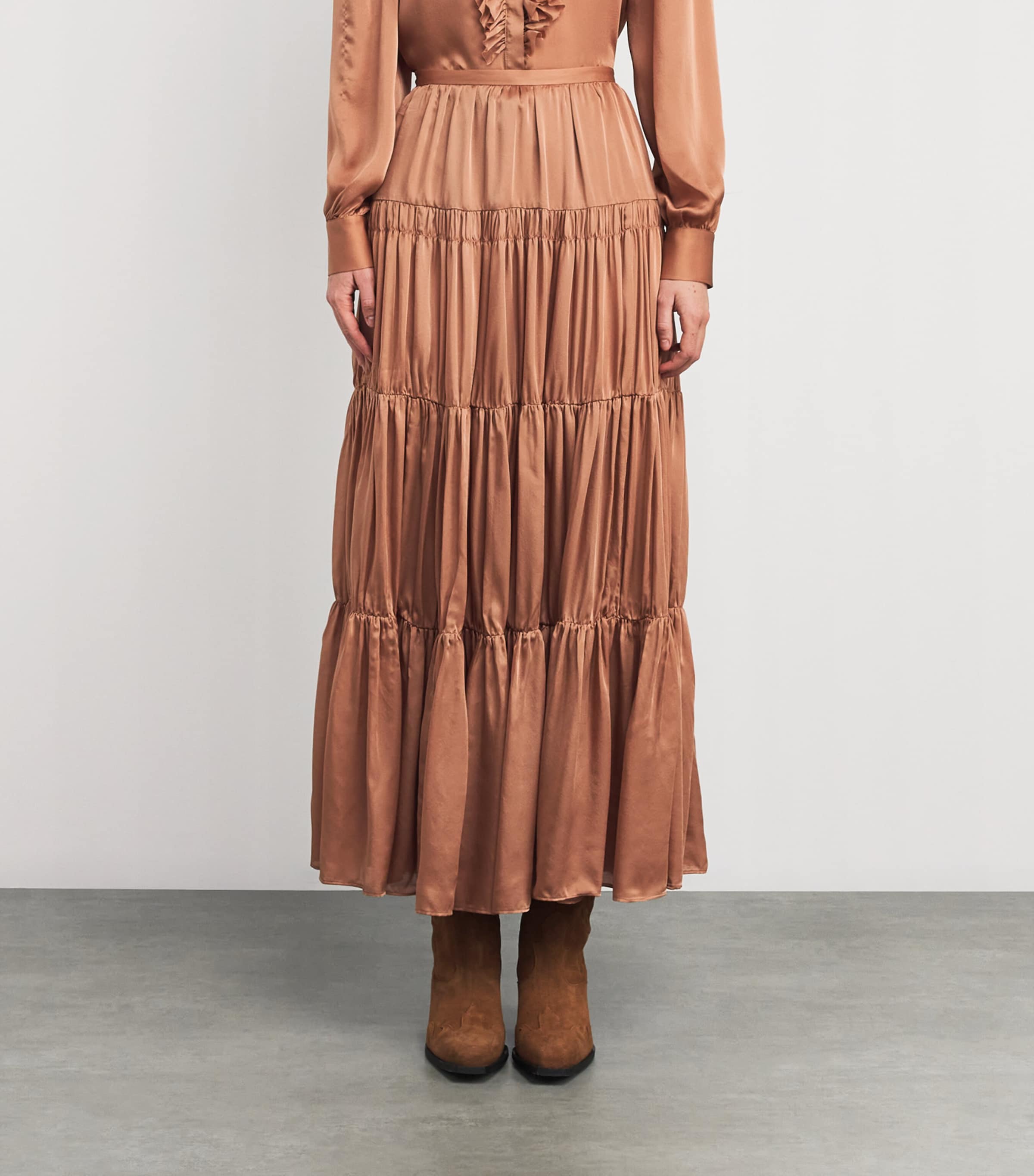 Ulla Johnson selbst lebt „viele Leben an einem Tag“, daher schwingt in all ihren Designs ein Gefühl ungezügelter Freiheit mit. Ein gutes Beispiel dafür ist der Gaelle-Maxirock: Er ist aus fließender Seide gefertigt und garantiert so höchsten Tragekomfort und optimale Bewegungsfreiheit, während die Stufenkonstruktion dafür sorgt, dass er ein echter Hingucker bleibt.