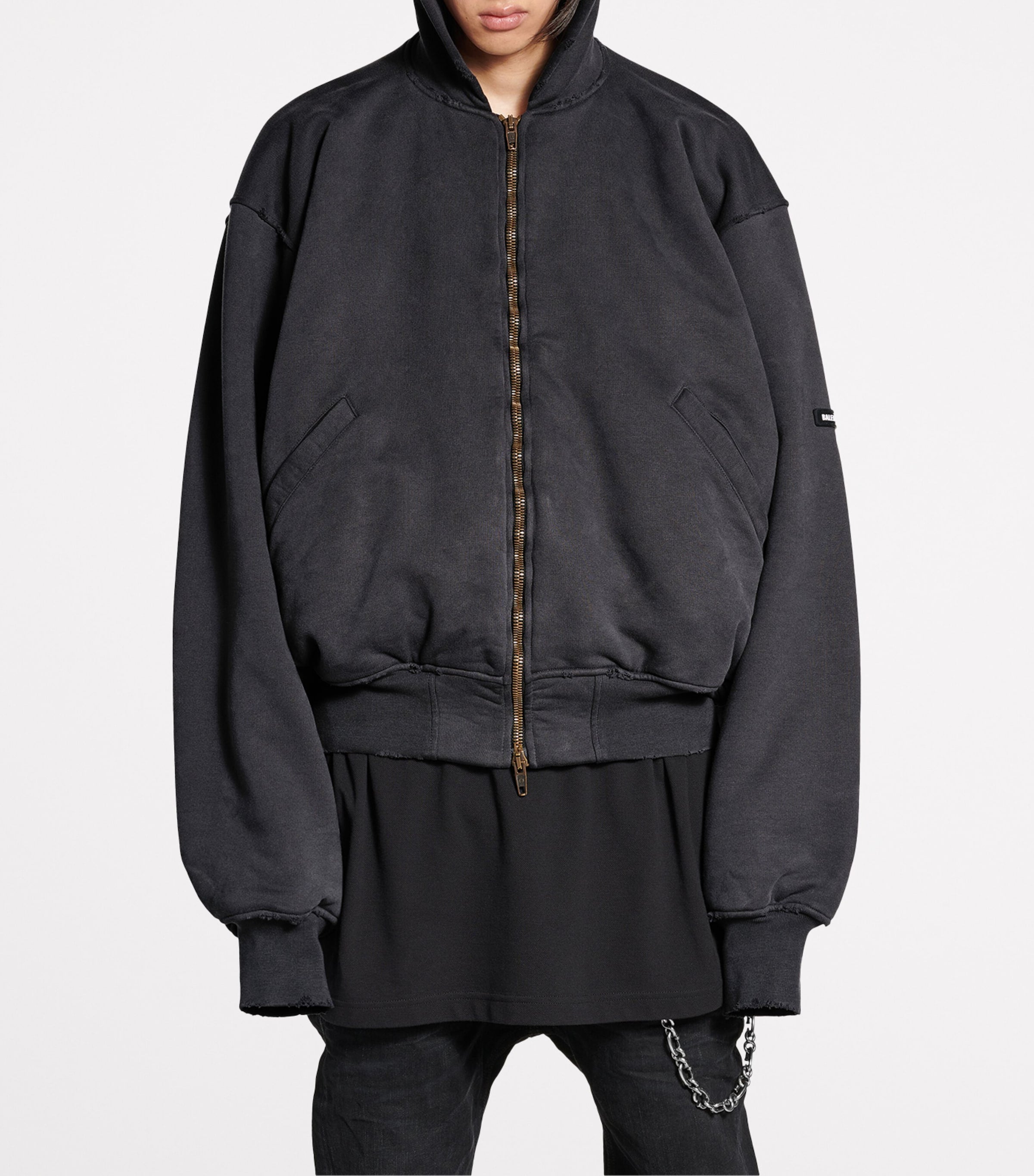 Balenciaga, bekannt für seine unkonventionellen Ansätze, interpretiert die klassische Bomberjacke neu und verpasst ihr eine ungewöhnliche Note am Halsausschnitt. Anstelle des Kragens wurde ein ausgeschnittener Hoodie als Kapuze angenäht, während die Jerseyärmel locker über dem technischen Schnitt herabhängen – ein lässiger Look, den man fast schon als „Inkognito“ bezeichnen könnte.