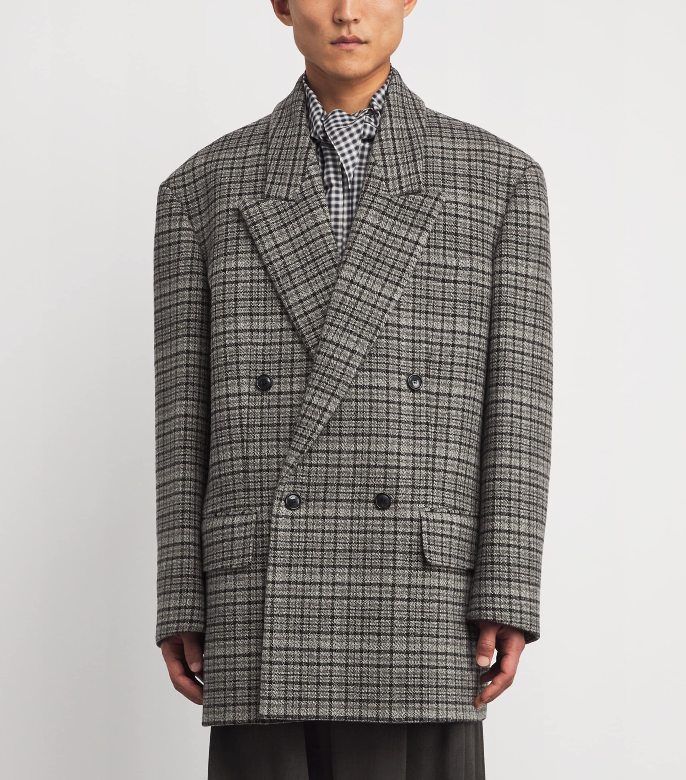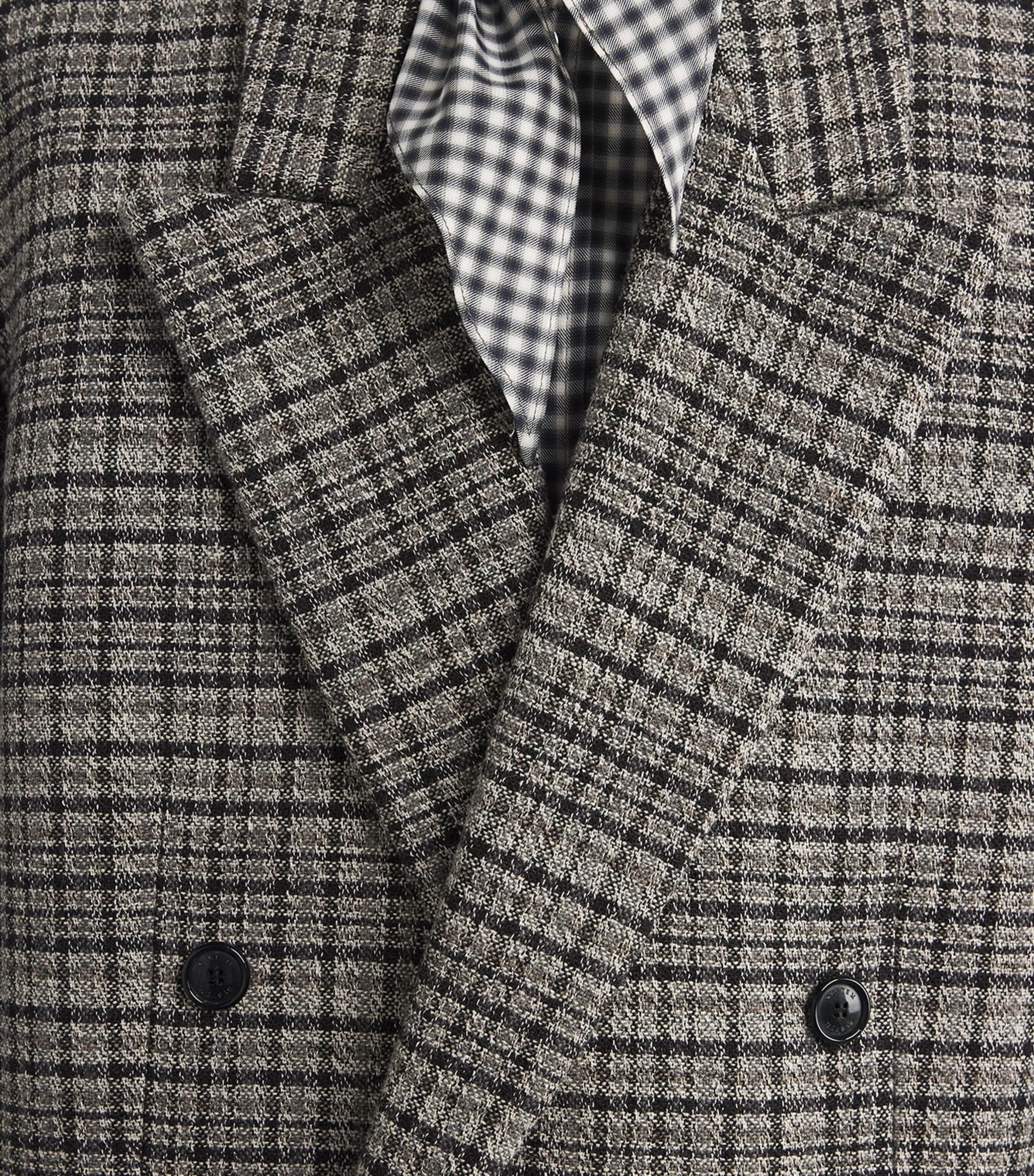Gefertigt in Korea, dem Heimatland der Marke, aus einem vielseitigen Wollmischgewebe. Die Herbst/Winter-Kollektion 2025 von System mit dem Titel „At The Very Moment“ erkundet die Kindheitserinnerung an das Stöbern im elterlichen Kleiderschrank. Dieser Einfluss und die damit verbundene Erzählkraft kommen in diesem zweireihigen Blazer durch seine Oversize-Silhouette und das klassische Karomuster des Wollmischgewebes deutlich zum Ausdruck und erinnern auf elegante Weise an Stile vergangener Jahrzehnte.