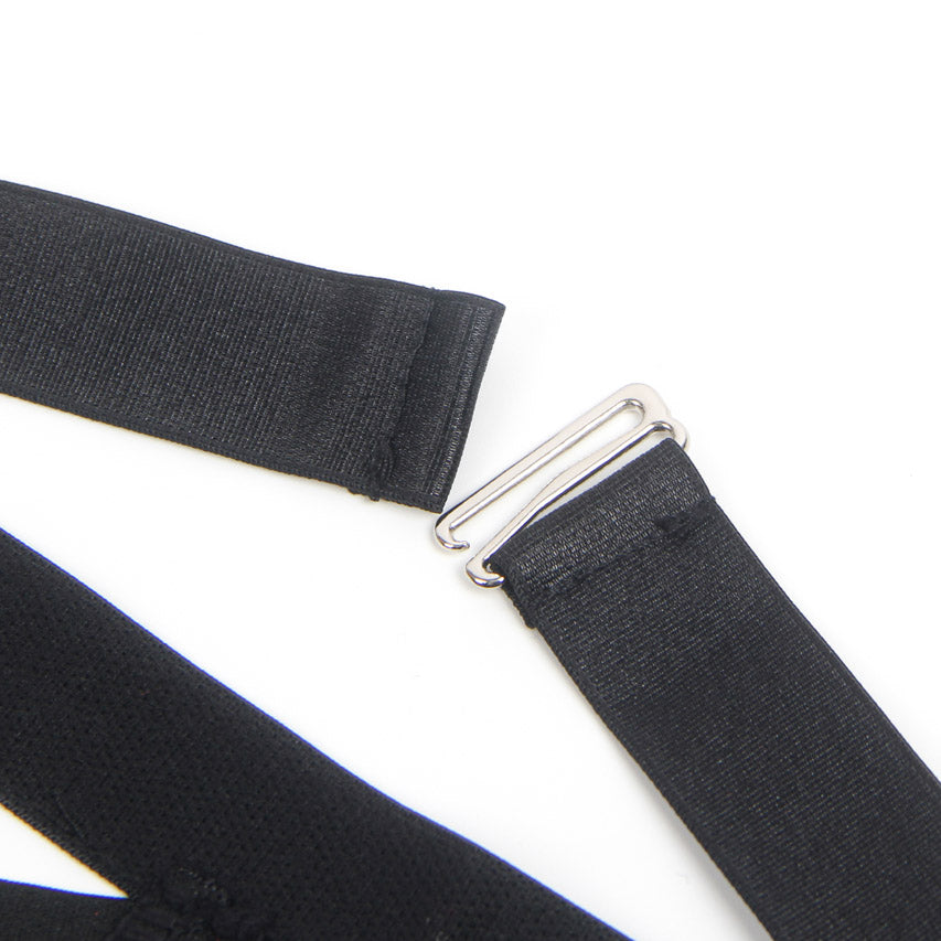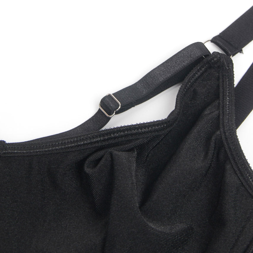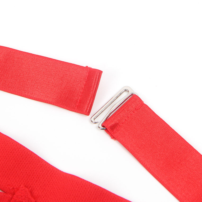 This erotic set includes a strappy bra with adjustable straps, panty, and a strappy garterbelt with adjustable straps. (Stockings not included.)