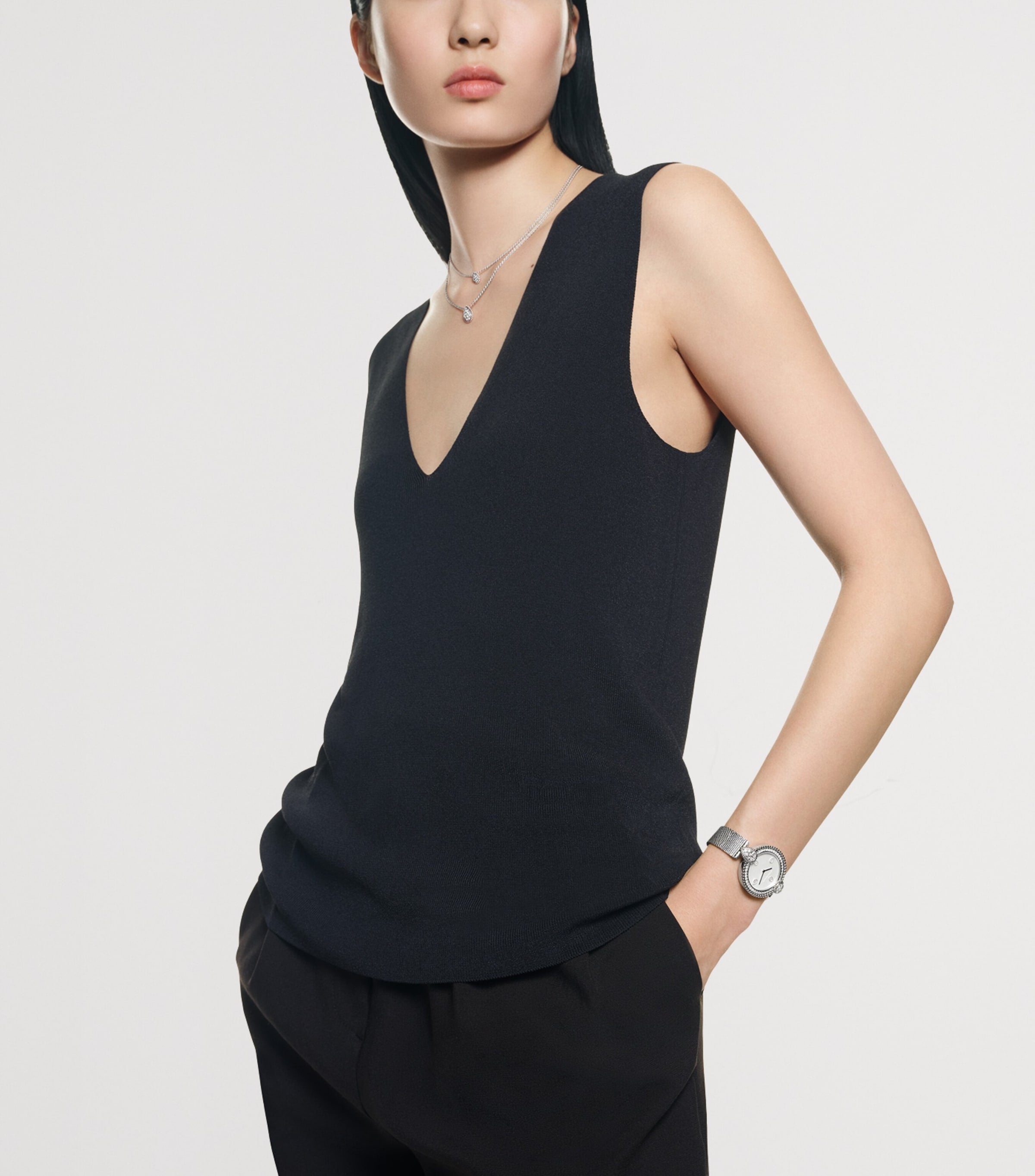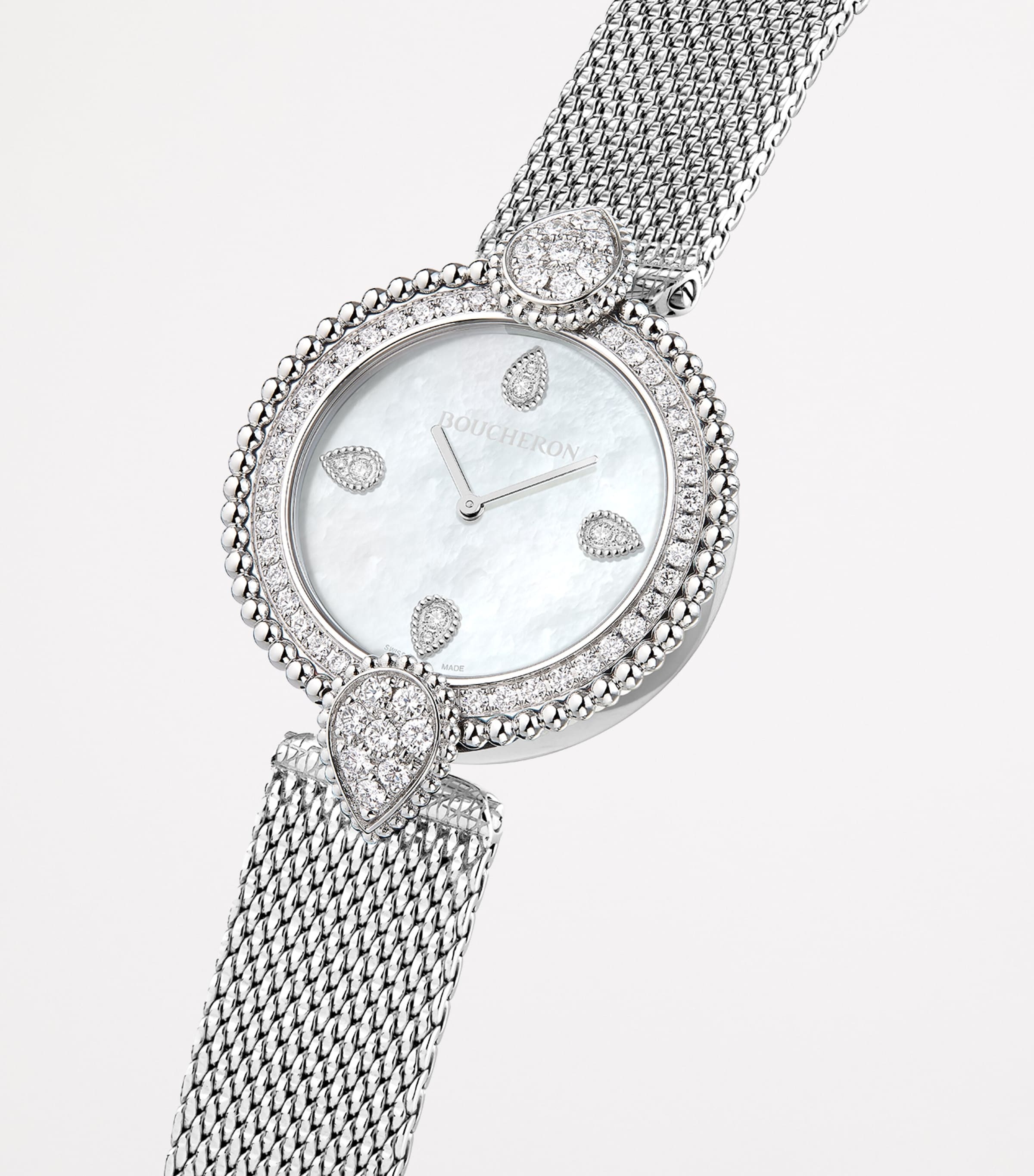 A protective talisman – and icon – of the Boucheron brand, the snake is the centrepiece of the Serpent Bohème collection. Inspired by a necklace Frédèric Boucheron gifted to his wife in 1888, this stunning timepiece recreates the smooth, shimmering lines of the reptile in its elegant construction. Hosting an opalescent mother-of-pearl dial, a surrounding frame of pavé diamonds provide opulent sparkle, while the linked steel strap lends a textural contrast.