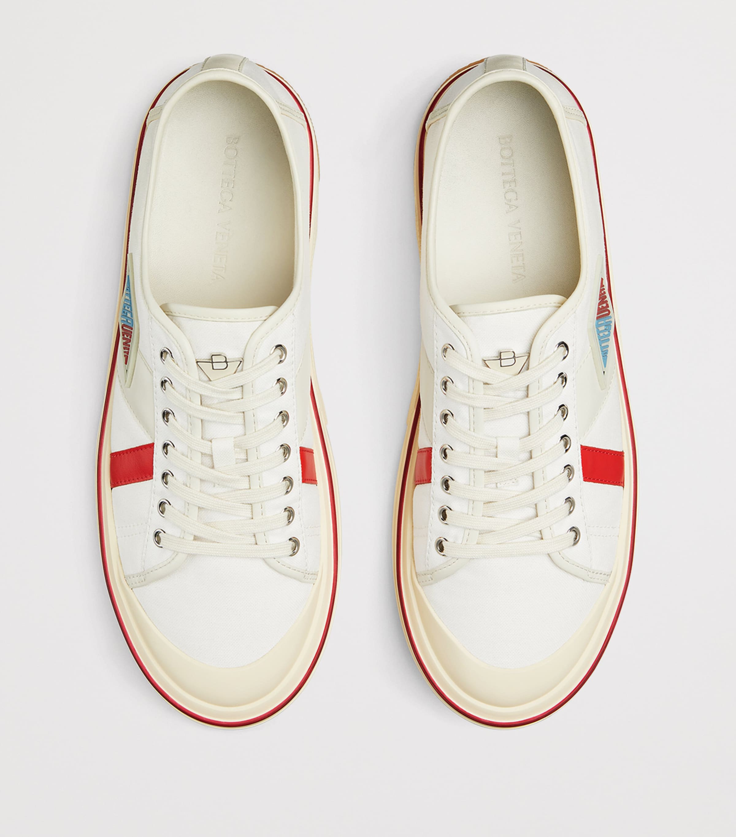 For the Eliot mid-top sneakers – which can be seen treading the House’s Spring/Summer 2025 runway, inspired by coming-of-age wonder – Bottega Veneta channels retro styling. Showcasing a distinct athletic look and sleek graphic lines, the pair’s lightweight canvas upper is accented with dashes of bold calfskin trims and the brand’s playful geometric logo in a colourful display.