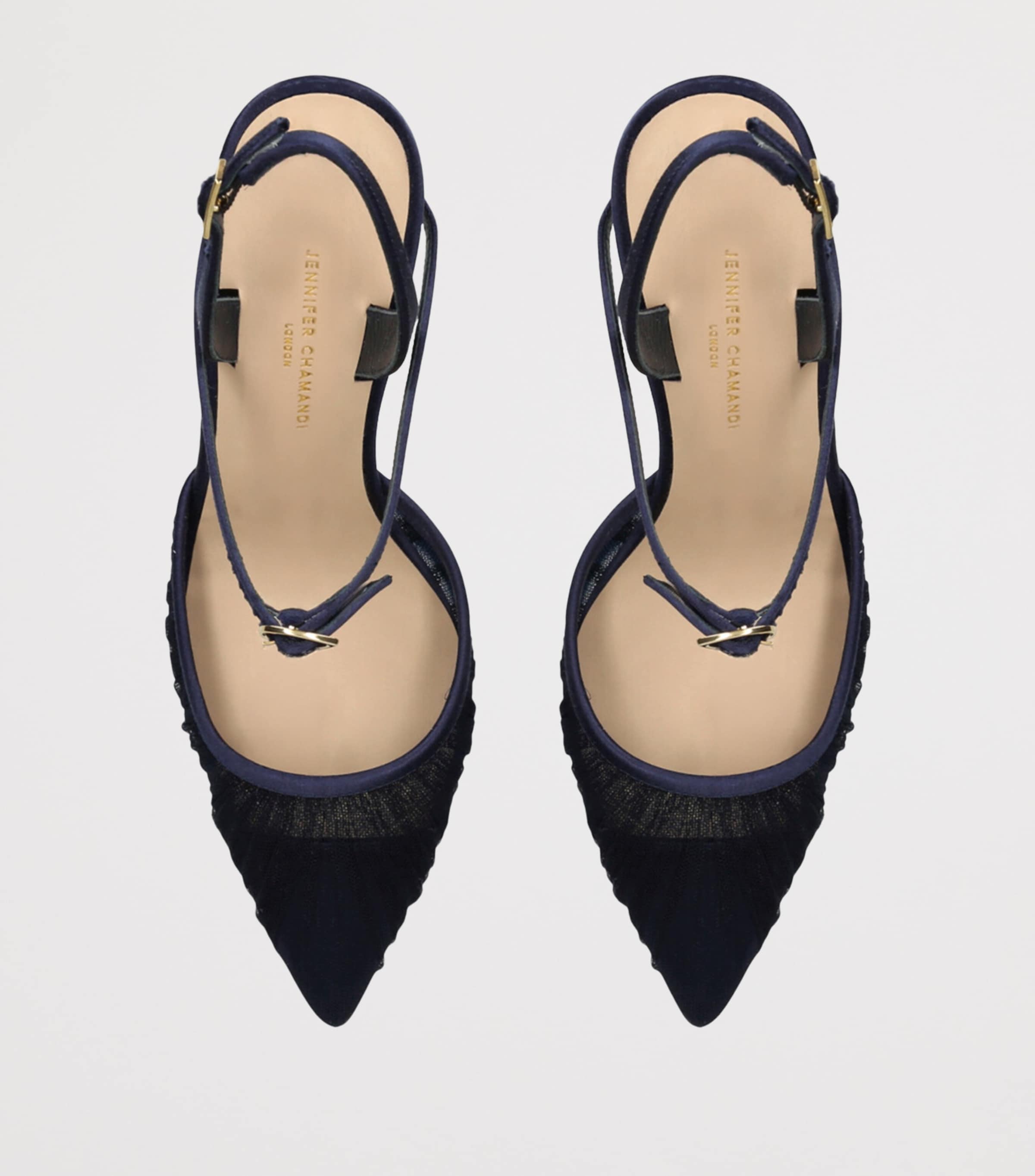 Proving that grace needn’t compromise on versatility, Jennifer Chamandi’s Vittorio pumps are defined by a slingback that can be worn two ways. Made in supple leather and with a delicate tulle toe, this pair features a detachable fine strap that can be threaded through the brand’s signature ‘Eye of the Needle’ — a heel detail that allows for eternal customisation.