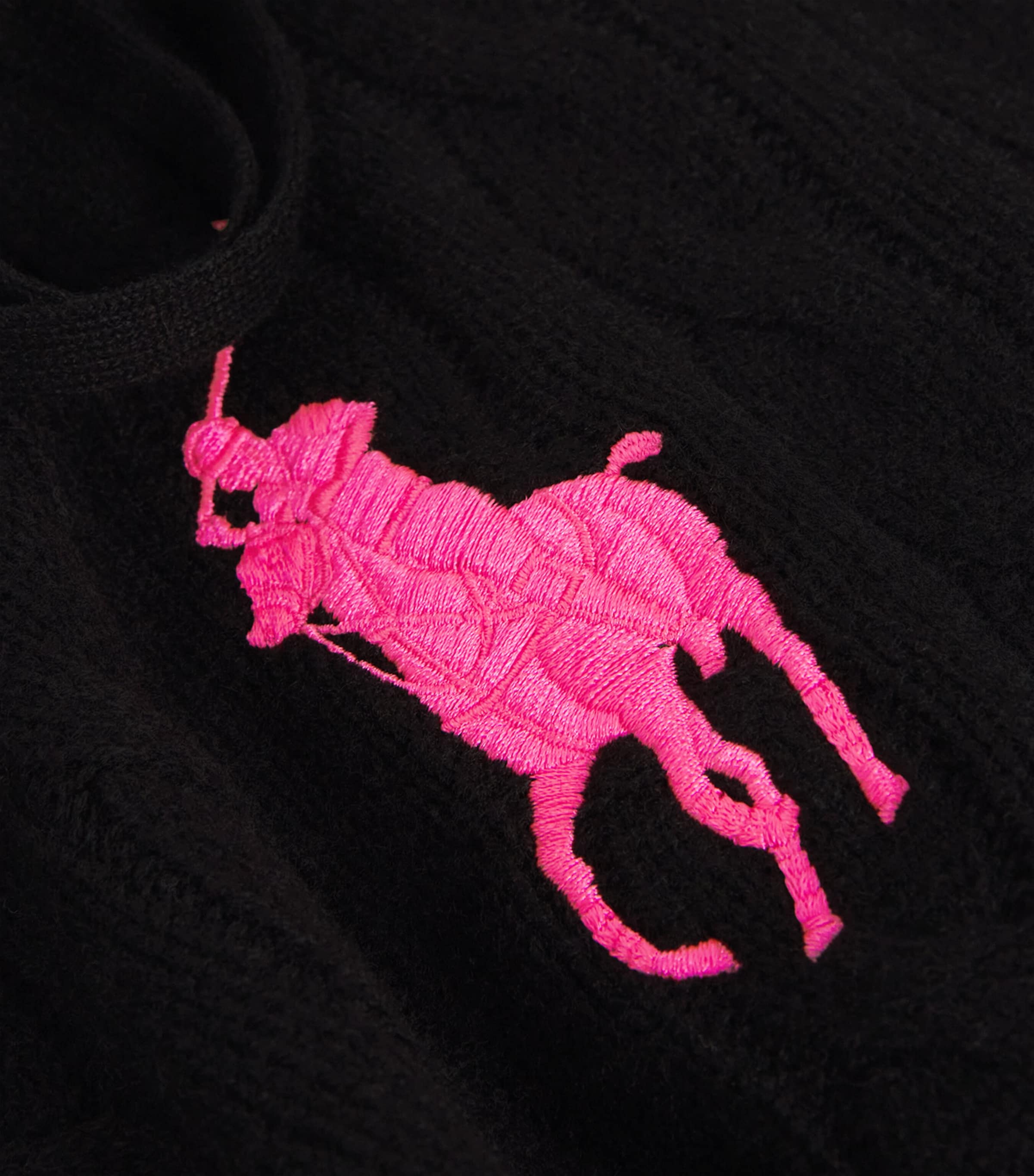 Schwarzer Woll-Kaschmir-Zopfstrick-Hoodie mit rosa Ponymuster