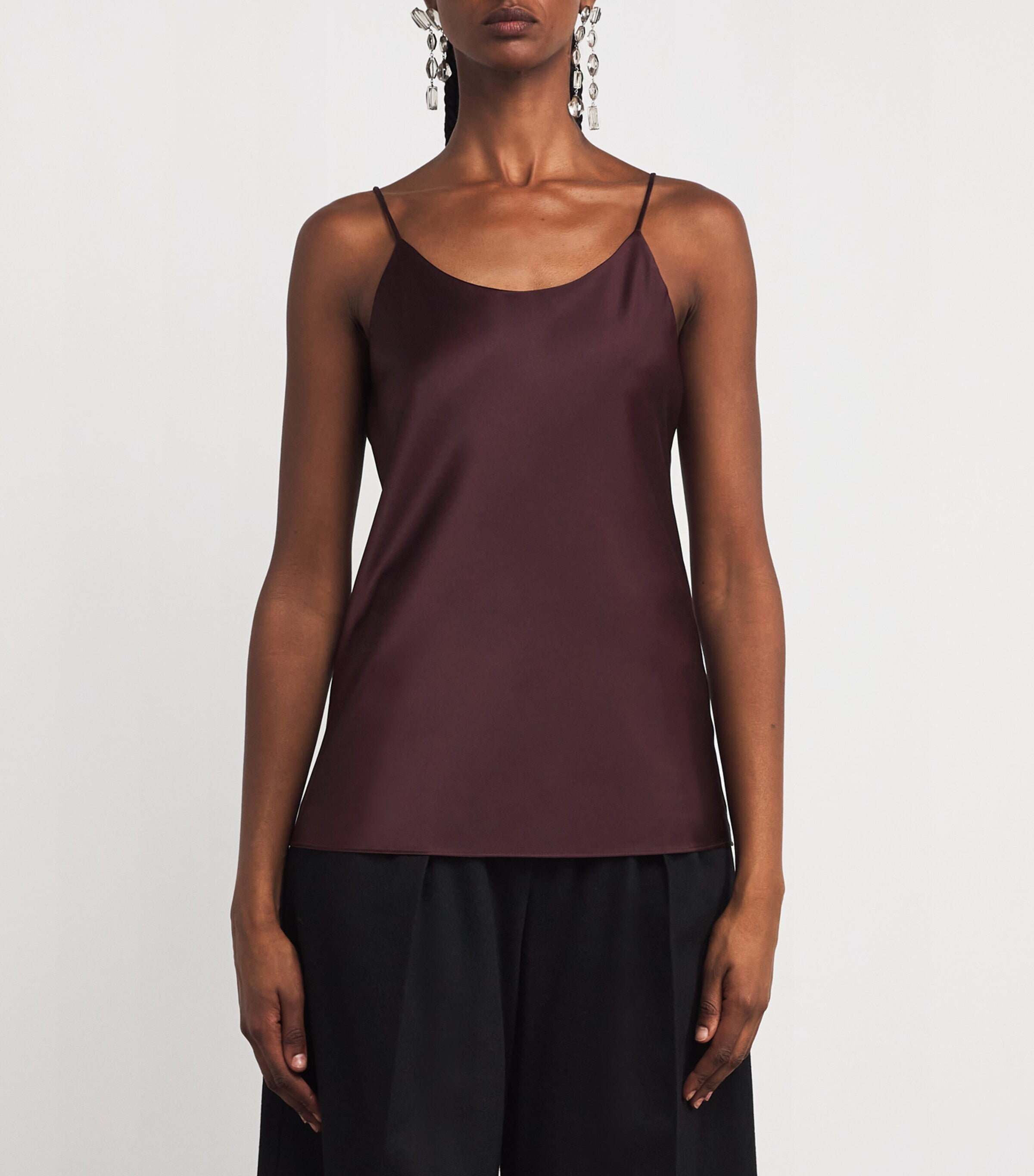 Dieses Seiden-Cami-Top von Max Mara ist ein Basic-Teil, das durch Stoff und Form besticht. Der tiefe Ausschnitt betont das Schlüsselbein, und die dünnen Spaghettiträger sorgen für eine leichte Silhouette. Dank des fließenden Falls lässt es sich mühelos unter einem Anzug tragen oder solo kombinieren – schlicht, aber niemals langweilig.