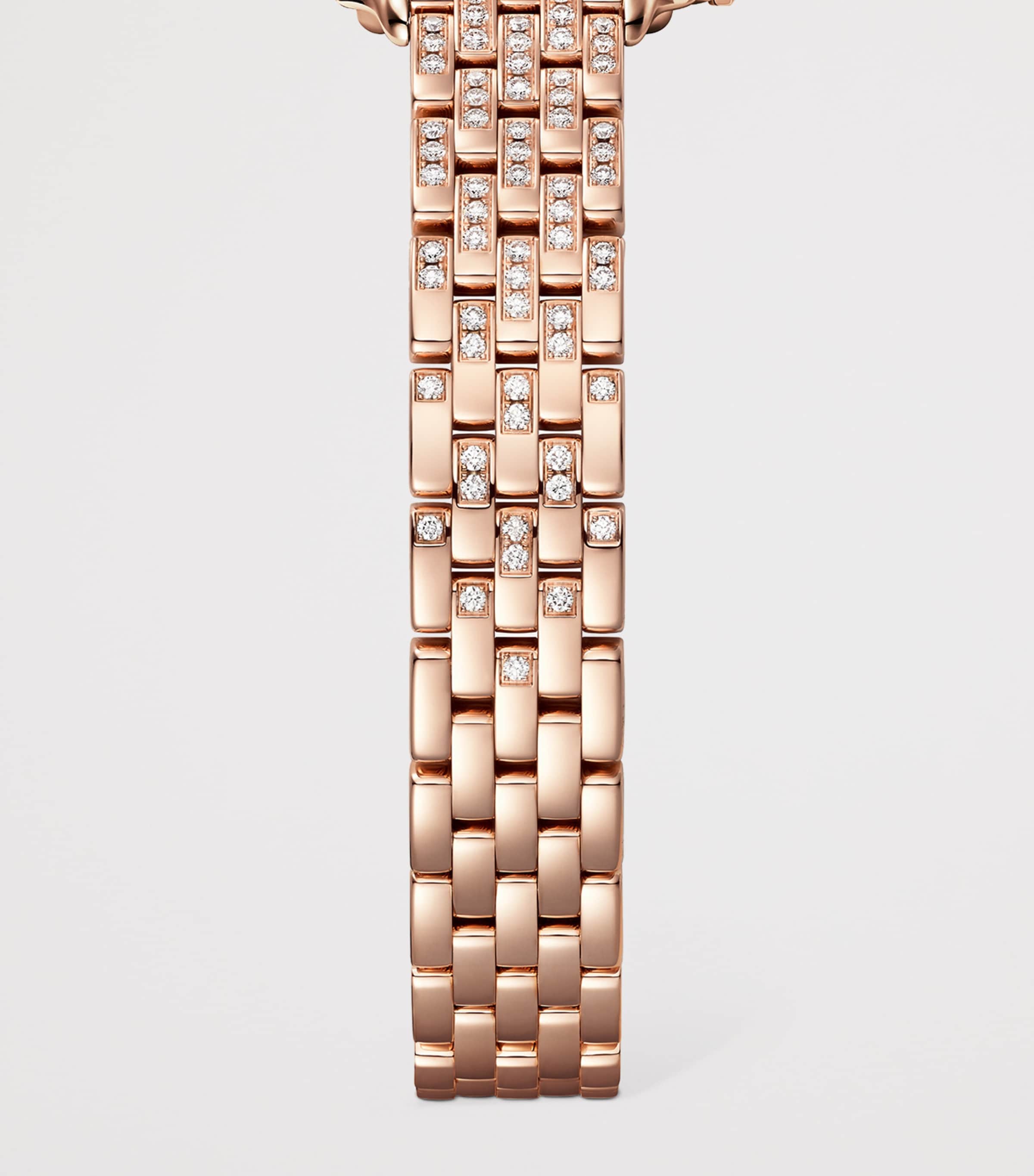 Inspired by an archival design from the '80s Must de Cartier collection, the Panthère de Cartier range perfectly toes the line between a watch and jewellery making these some of Cartier's most distinctive timepieces for women. Contemporising the icon with new finishes - this style is realised in 18-karat rose gold – the re-edition bears the original square face, screwed-down bezel and linked brick-lay bracelet with the concealed folding clasp that makes the design so comfortable on the wrist. Set with brilliant-cut white diamonds across the dial and strap, a silvered dial and sword-shaped hands, this luxurious accessory is finished with elongated Roman numerals and the secret Cartier signature in the 'X' at 10 o'clock.