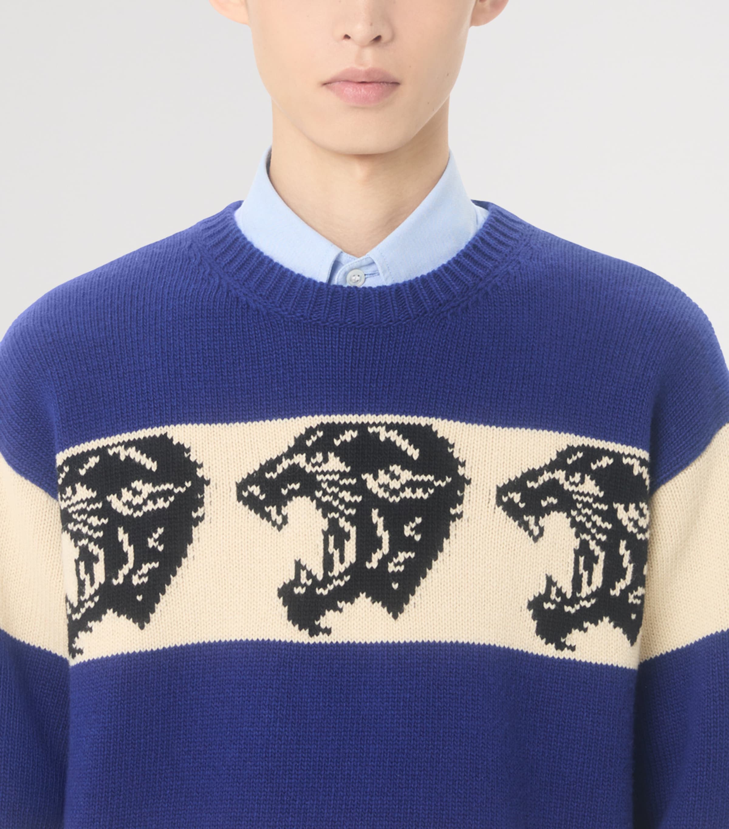 Der Panther ist seit Langem ein wiederkehrendes Motiv in Valentinos Kollektionen. Schon in den 70er-Jahren wurden die Assoziationen der Katze durch markante grafische Prints erforscht. Alessandro Michele führt diese Vorliebe hier mit einem Pullover aus Schurwolle mit Intarsienmuster fort und verleiht dem Streifenmuster eine kühne Note.