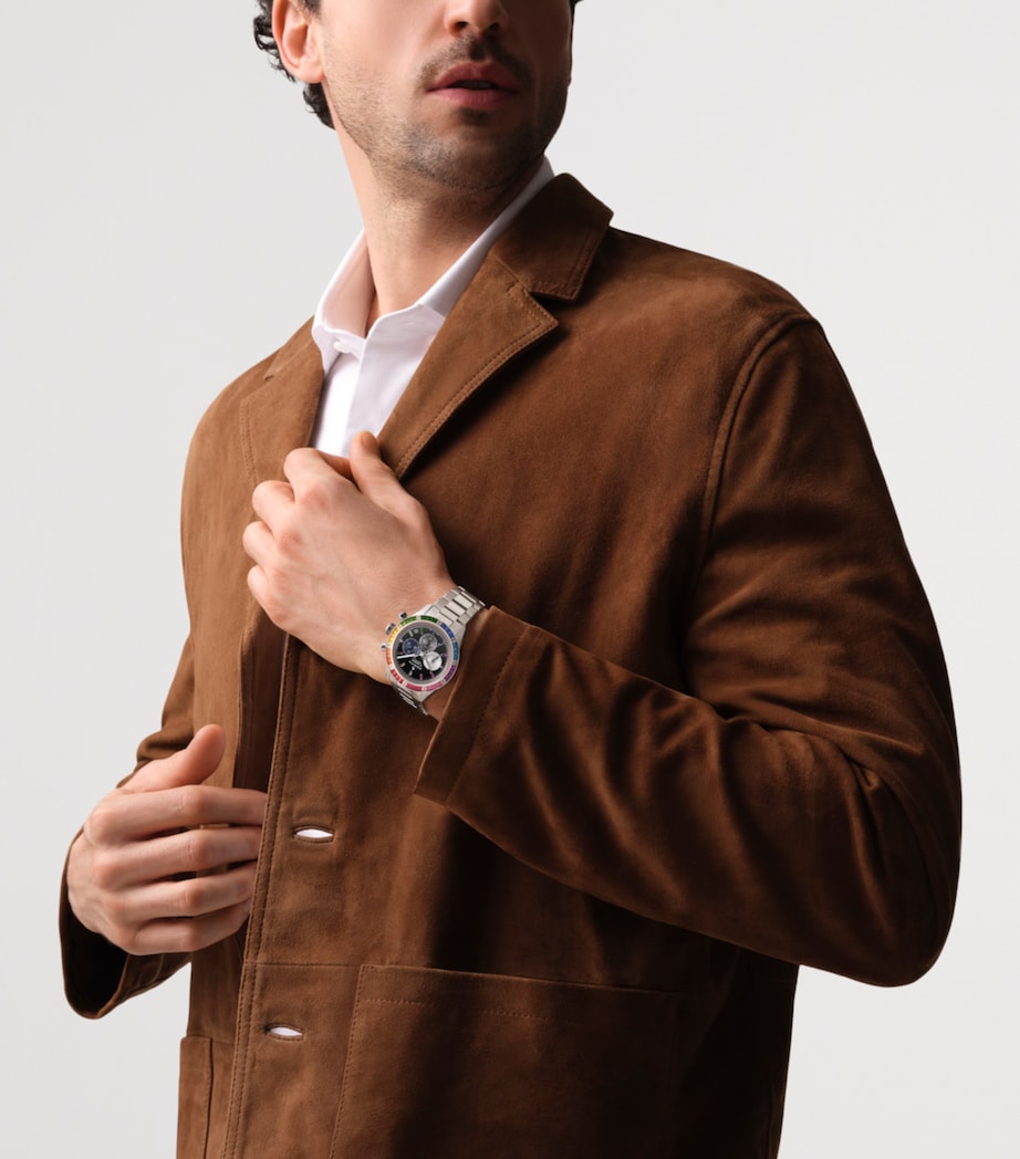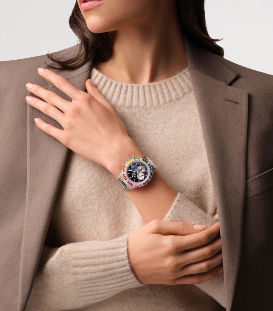 With the new edition of the Chronomaster Sport, Zenith combines the technical prowess of its predecessors with a high-jewellery execution. The tricolour dial has been a signature since 1969 and remains firmly in place, while the bezel is set with baguette-cut diamonds and rainbow sapphires – a match for the hour markers on its black lacquered dial. The coveted El Primero movement pushes performance to the maximum point, offering an extended power reserve of 60 hours and a display that’s able to precisely read one tenth of a second.