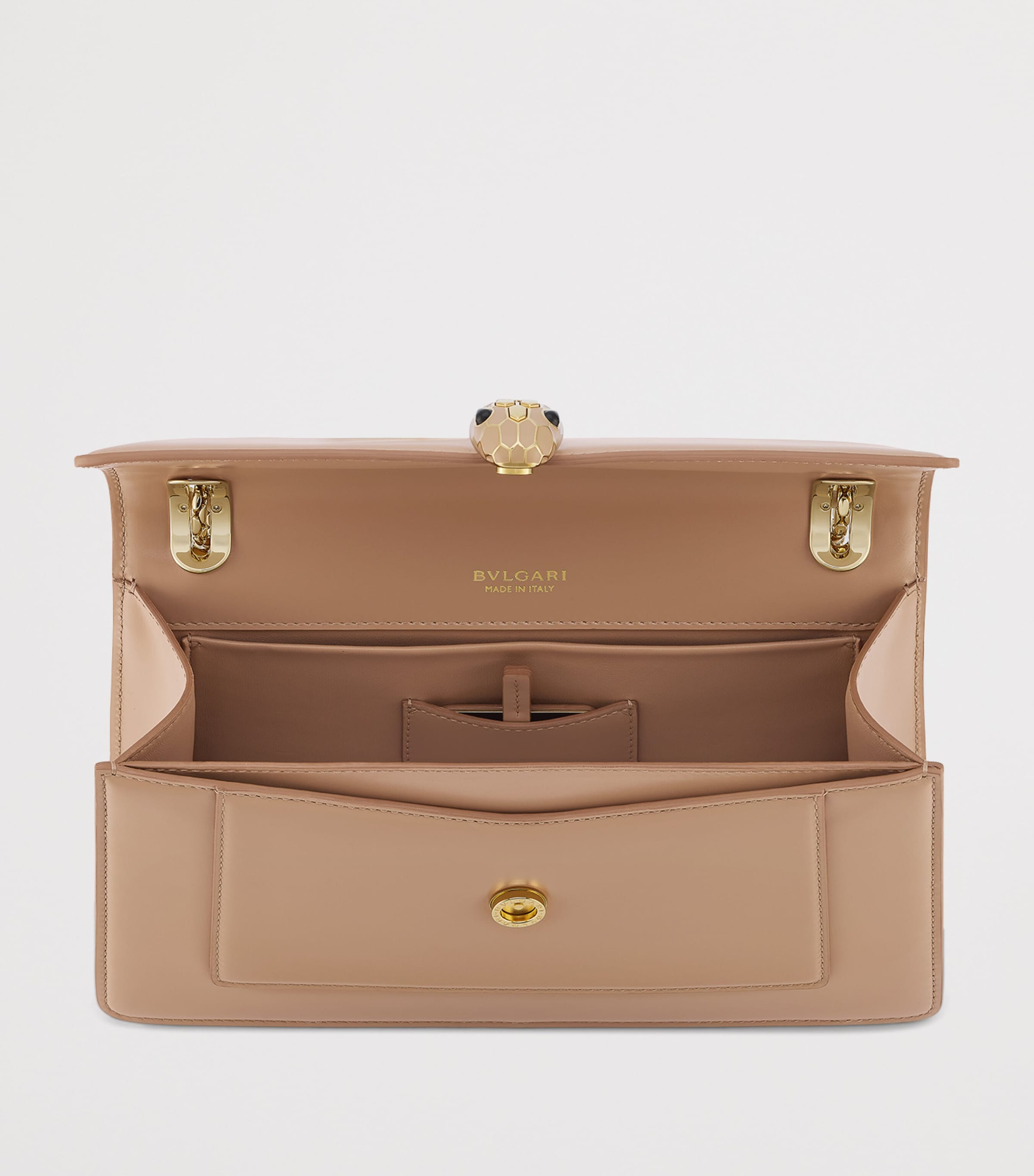 Crowned with snakehead hardware – the hallmark of Bvlgari's Serpenti collection – the Forever shoulder bag is an heirloom in the making. Crafted from Travertine calfskin for a supple touch, the sleek silhouette boasts a flap front which opens to reveal a pocketed interior and customisable mirror – all while hanging from a snake-inspired Cobra chain.