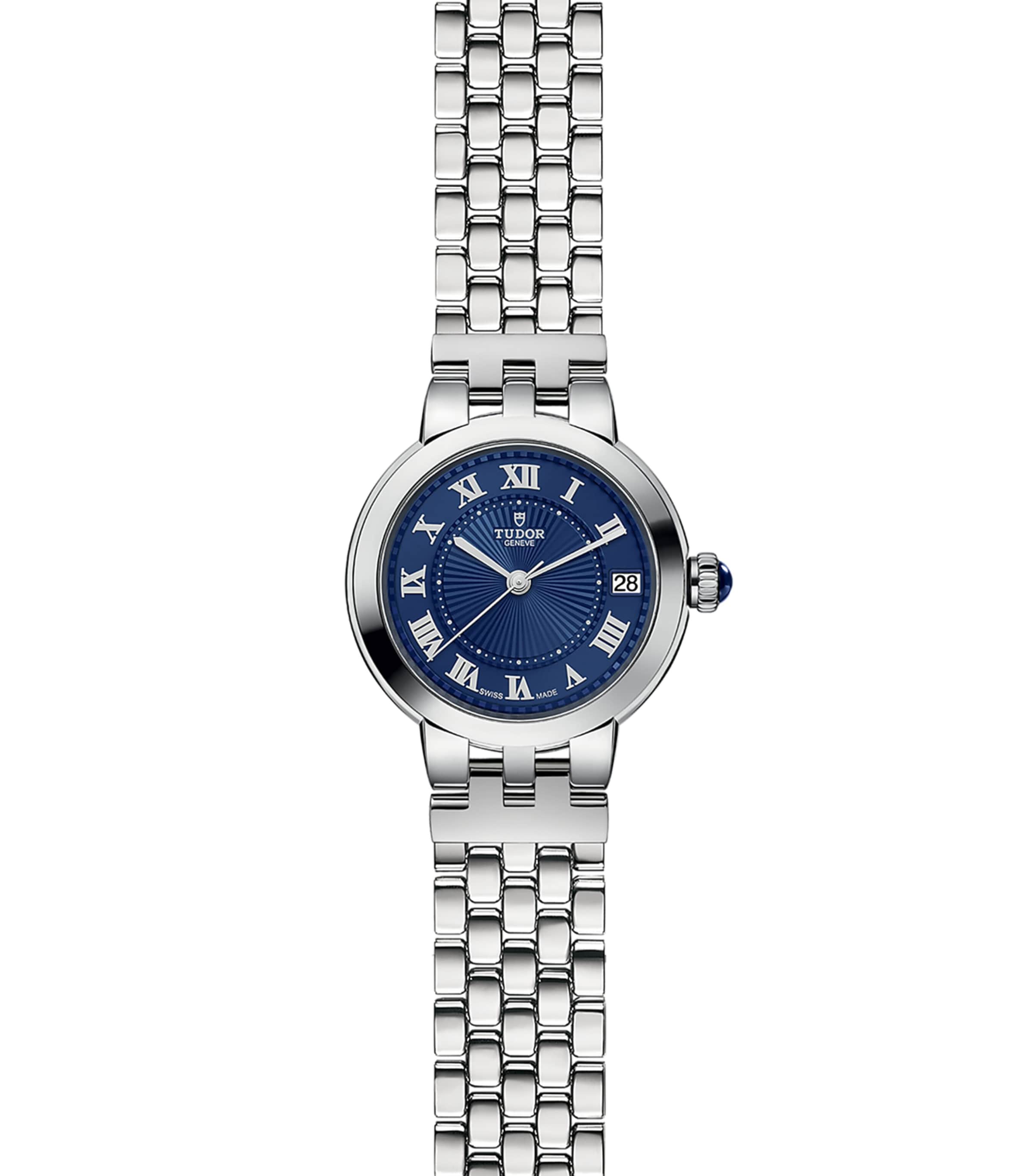 An air of romance surrounds the timeless TUDOR Clair de Rose watch. Revisiting a model from its archives, the esteemed watchmaker offers a selection of Clair de Rose timepieces, each defined by crisp stainless steel and mechanical movements. Measuring 34mm, this larger iteration is perfect for a woman's wrist, while its elegant Roman numerals, winding crown and spinel cabochon will appeal to those with a taste for the refined.