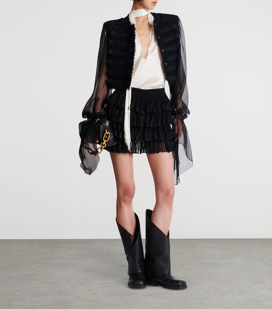 Für Ihre Abendgarderobe ist Balmain die perfekte Wahl. Für einen atemberaubenden Party-Look entscheiden Sie sich für dieses Seidentop von Balmain. Der fließende Satin kommt durch den tiefen, mit Spitze besetzten Ausschnitt, den tiefen Rückenausschnitt und die drapierten Nackenbänder, die mit Fransen verziert sind, besonders gut zur Geltung.