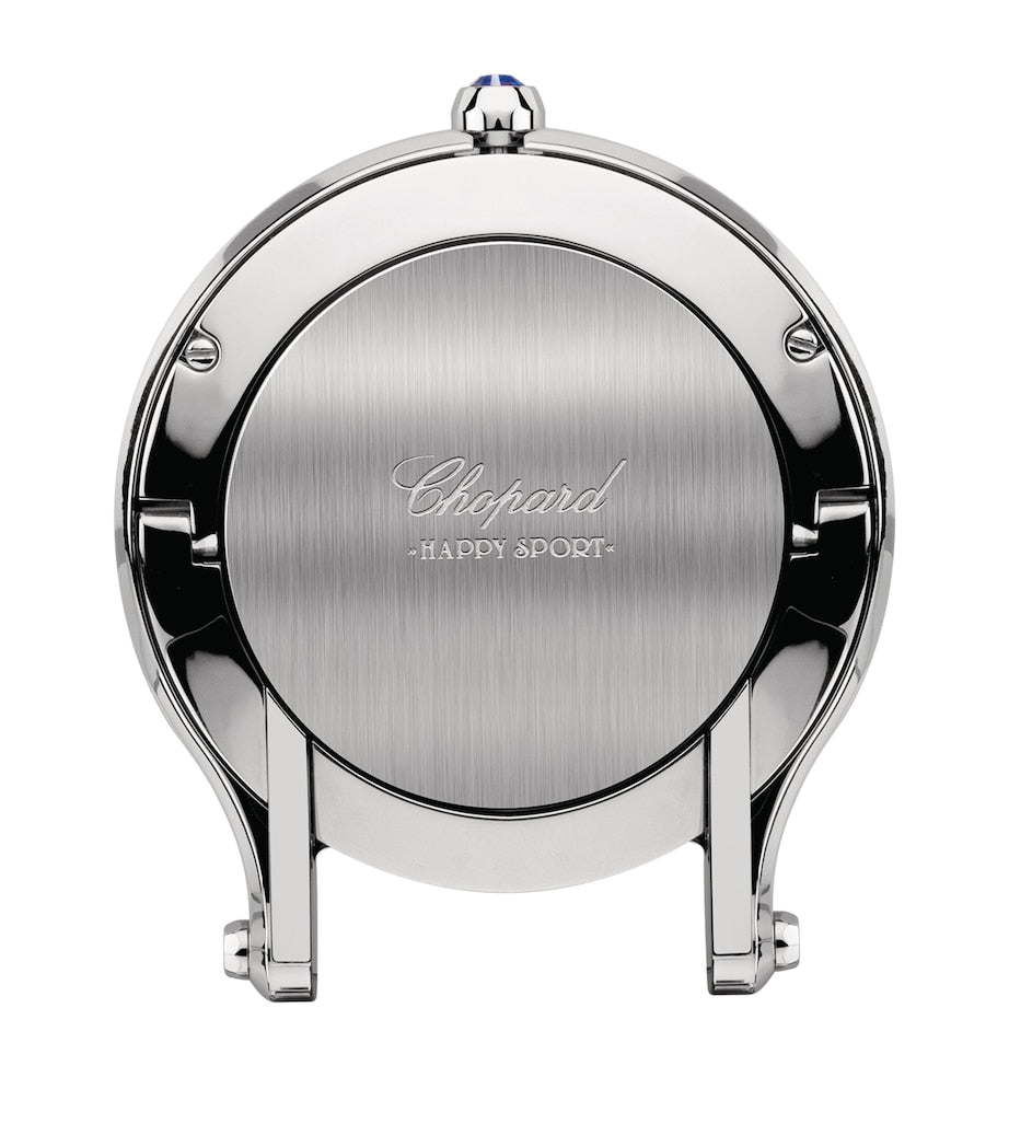 Known for adorning your wrist with the finest timepieces, Chopard now brings its unsurpassed savoir-faire to your home decor with this table-clock iteration of the coveted Happy Sport model. First introduced in 1993, the design broke new ground in the world of horology by combining diamonds with a stainless steel case. Here, the precious stones may be absent, but a silvery finish offers an equal amount of lustre, further enhanced by a classic blue dial and cabochon. Model number: 95020-0119