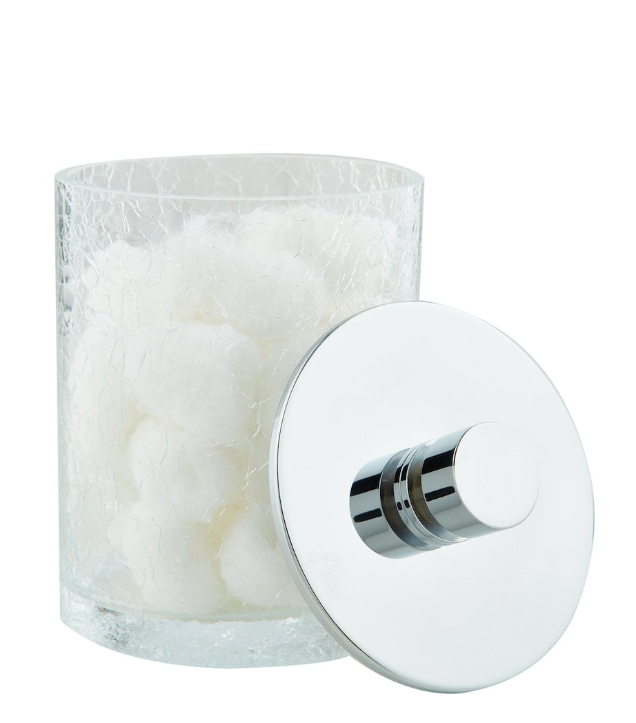 Lend a designer finishing touch to your bathroom with Zodiac's cracked crystalglass jar. Featuring an exquisite cracked crystaleffect and topped with a solid brass lid with a slick chrome finish, this piece is both practical and stylish; perfect for storing cotton wool balls.