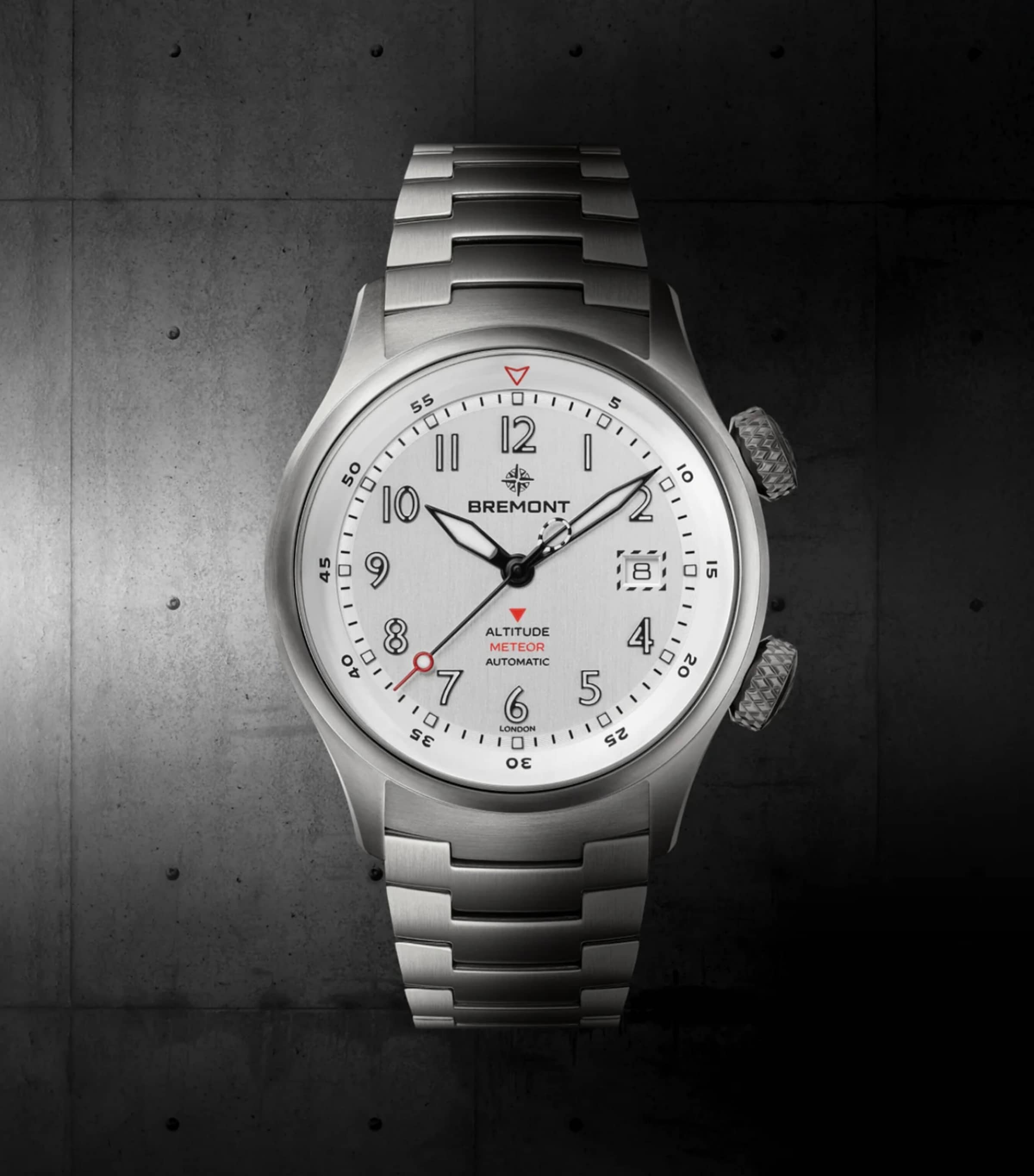Bremont’s Altitude MB Meteor takes its name from the Gloster Meteor – Britain’s first jet fighter that pioneered turbojet technology in the 1940s. Like its namesake, the watch is something of an innovator; a reengineered, grade 2 titanium Trip-Tick case features two crowns to wind and set the watch and operate the bi-directional inner bezel. An anti-magnetic open case-back showcases the 68-hour BB14 movement, known for its mechanical reliability.