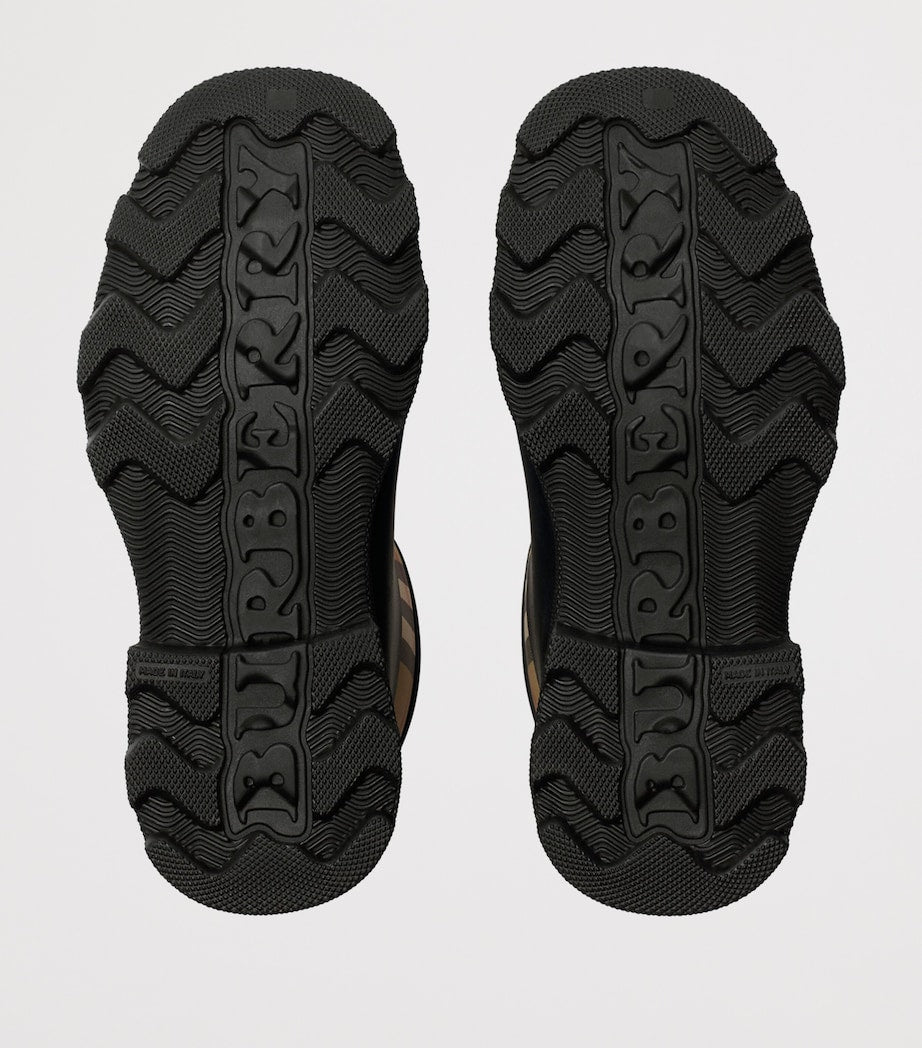 Als Beispiel für Burberrys praktischen Umgang mit den britischen Jahreszeiten sind diese Stiefel vollständig aus Funktionsmaterial gefertigt. Dabei wird keine Kompromisse beim Stil eingegangen: Das Design besticht durch eine Öffnung, die von klassischen Reitstiefeln inspiriert ist, und eine robuste Profilsohle mit eingeprägtem Markenlogo – perfekt, um auch im Gelände Spuren zu hinterlassen.