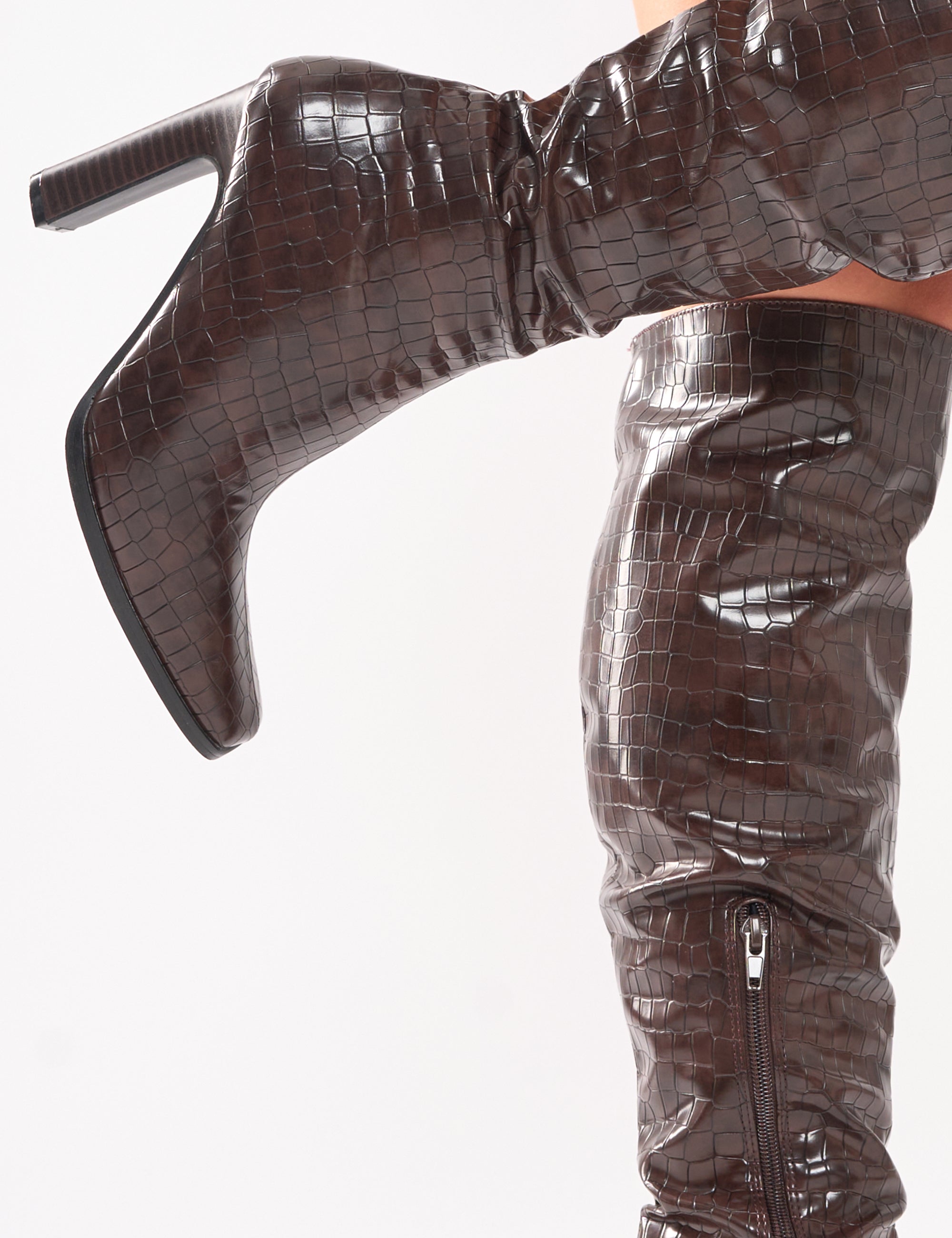 Acquilla Brown Croc Knee High Flared Heel Boots