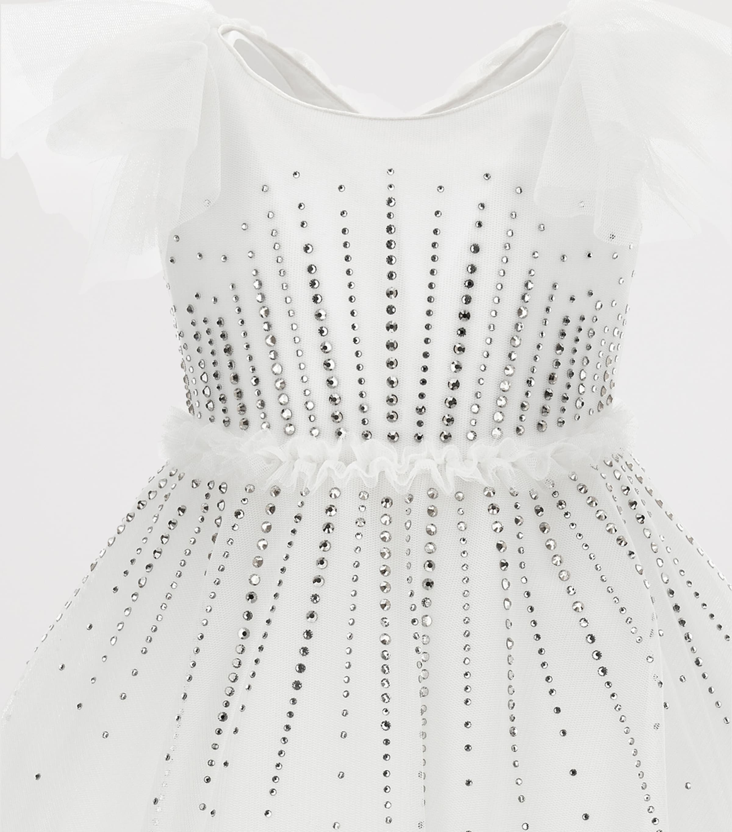 With a skirt made from layers of voluminous tulle and sparkling rhinestones affixed to the front that look like shooting stars, this dress from Monnalisa is sure to delight the young fashionista. The zipped top is made from jersey and the skirt has a cotton lining, keeping them comfortable even as they enchant the room.