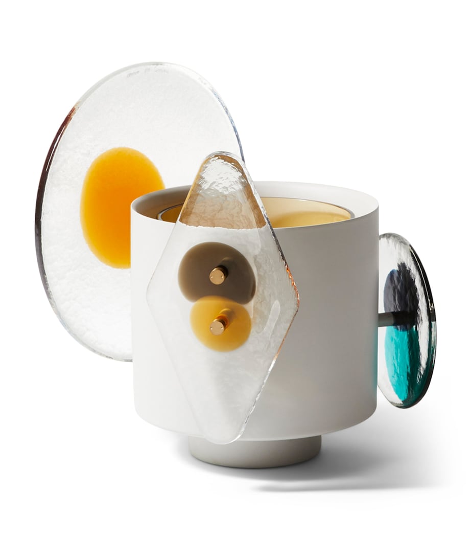 Designed with British artist Bethan Laura Wood, Cassina presents the Colourdisc collection, a vibrant display of contemporary eclecticism made in collaboration with fellow Italian label Venini. The structural piece is made of a lacquered brass body accented with Murano glass. The individual tiles are cast in metal moulds and coloured thanks to the overlapping of two dots of colour from the Venini Archive, in a special colour combination. An optional blown glass vase in amber or horizon blue can be inserted as an extra pop of colour, and to make it safer to use the vase for water-fed flowers.