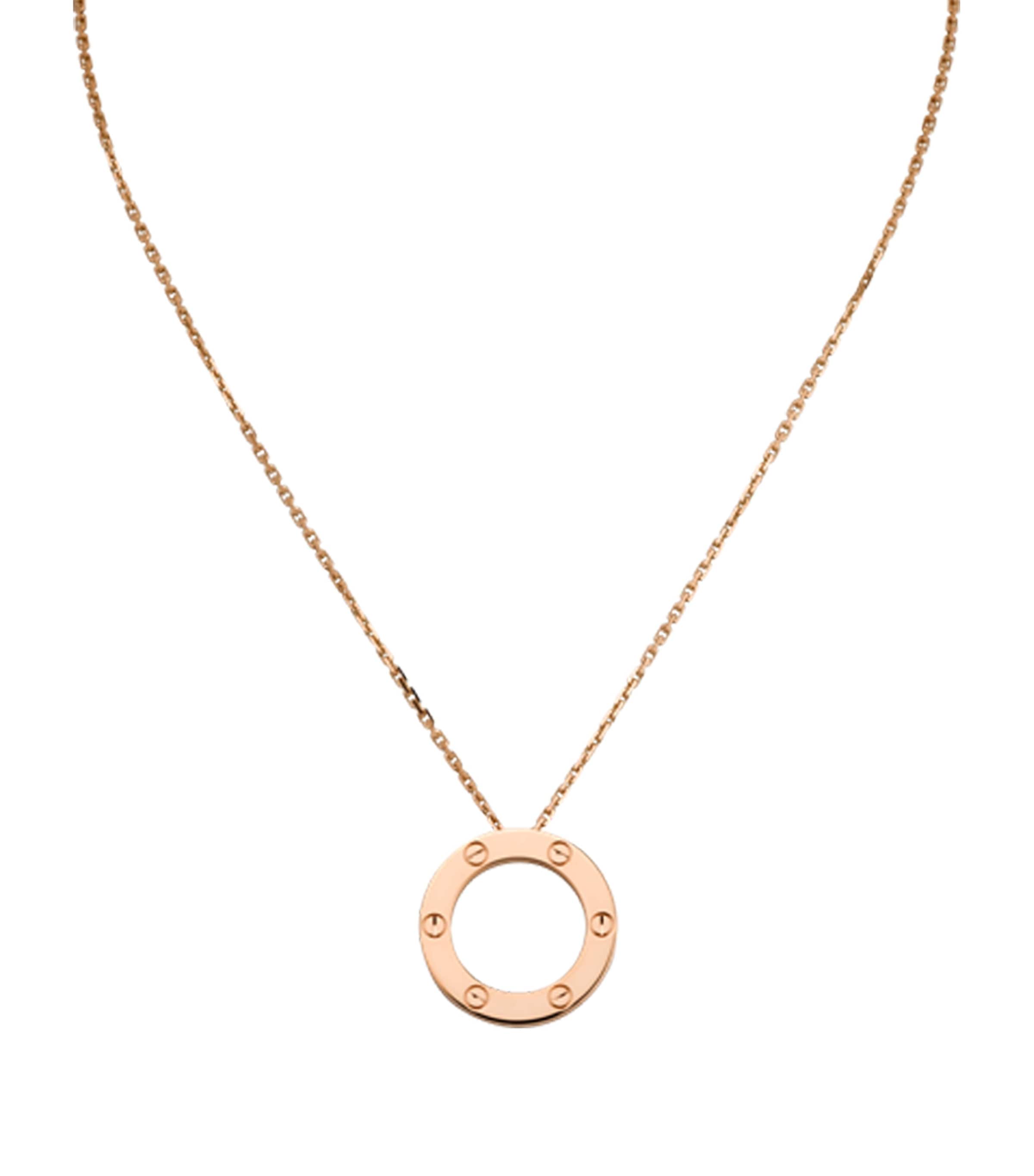 When one thinks of Cartier, the LOVE collection likely springs to mind. It was conceptualised by legendary jewellery designer Aldo Cipullo in 1969 and has since become an icon. It’s prized for its symbolism, evoking an eternal bond with screw details that suggest the wearer is locked into love. These romantic notions are here translated into a rose gold necklace.