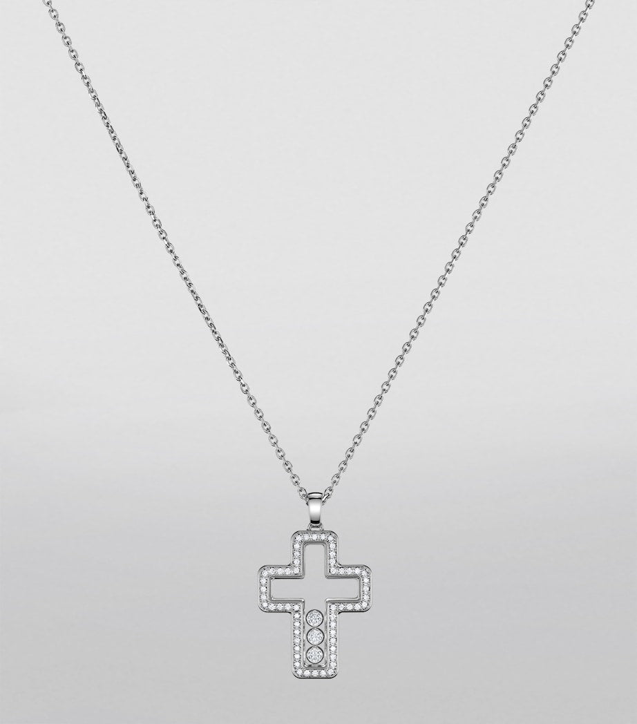 “Diamonds are happier when they are free”, declared the mother of artistic director Caroline Scheufele in the ‘70s upon being introduced to Chopard’s latest innovation: watches with floating diamonds said to be inspired by the glorious spray from a waterfall. Today, modern jewellery iterations like the Happy Diamonds Cross necklace evoke the same reaction and joie de vivre, enlivening the mood with their dancing gemstones and precious 18-karat white gold encasing.