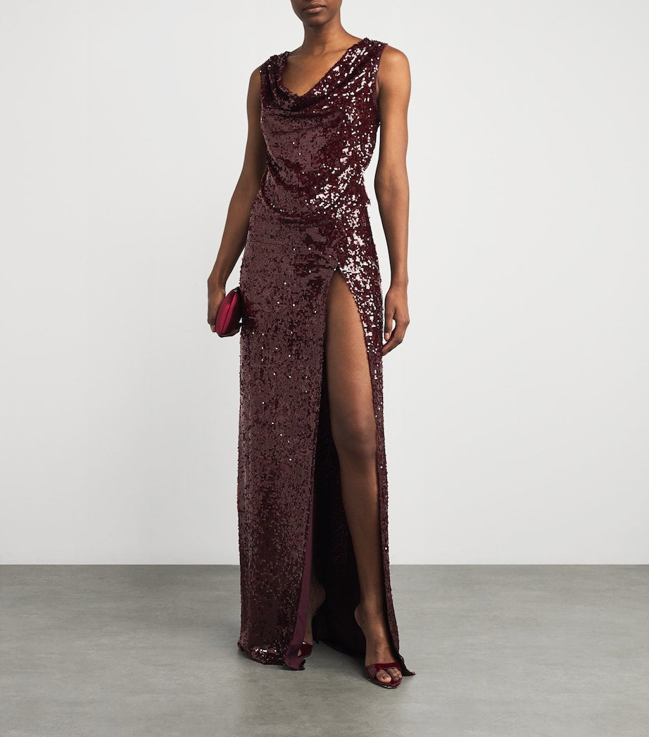 Lapointe’s creative director, Sally LaPointe, believes that fashion can illicit confidence, which is why she often opts for shimmering embellishments in her designs to achieve that wow-factor feel and look. This cowl-neck top from the American brand is saturated with sequins in a shade of burgundy, matching the coordinating maxi skirt.