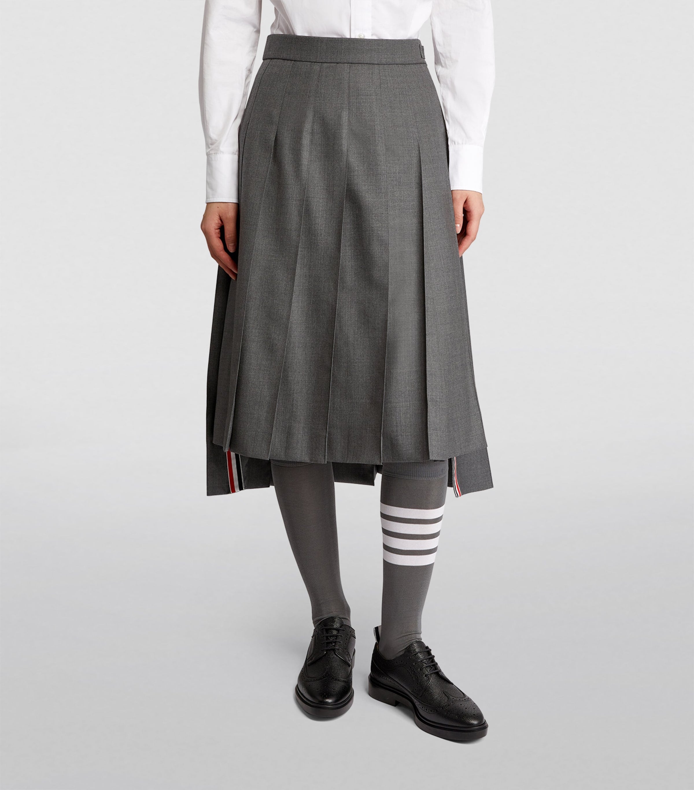 Breaking binaries comes naturally to designers like Thom Browne – after all, his eponymous brand single-handedly confirmed the classic pleated skirt as a genderless silhouette, creating similar styles for both its Autumn/Winter 2023 ready-to-wear and menswear collections. This iteration, with its below-the-knee length and tri-colour stripe detailing, perfectly conveys the preppy American sensibility for which the label’s renowned.
