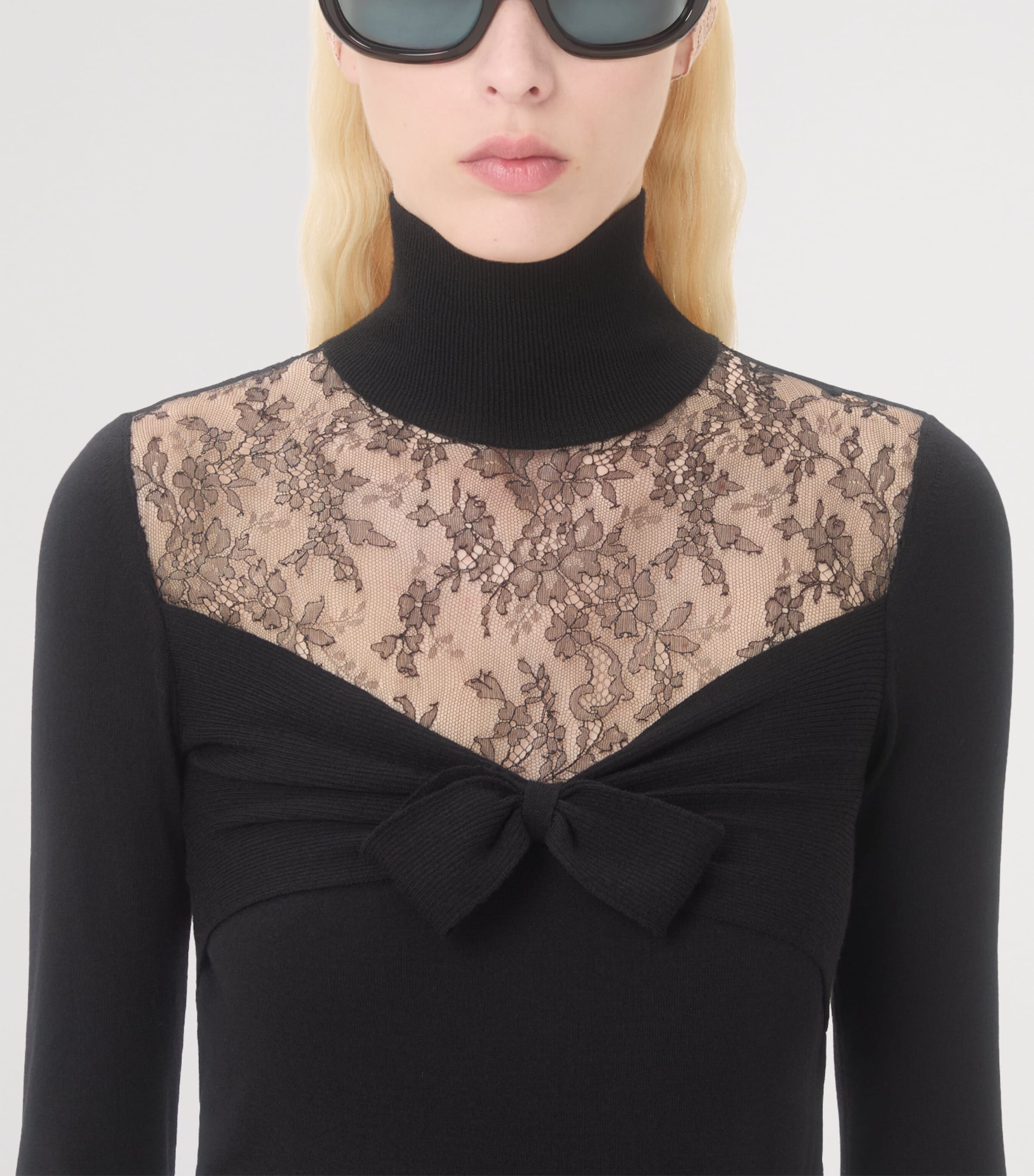 This Valentino top combines the warmth and structure of soft wool with a delicate sheer lace neckline and floral detailing that continues along the hems, while a central bow anchors the silhouette. This interplay of opacity and transparency, softness and structure, creates a striking, multidimensional piece.