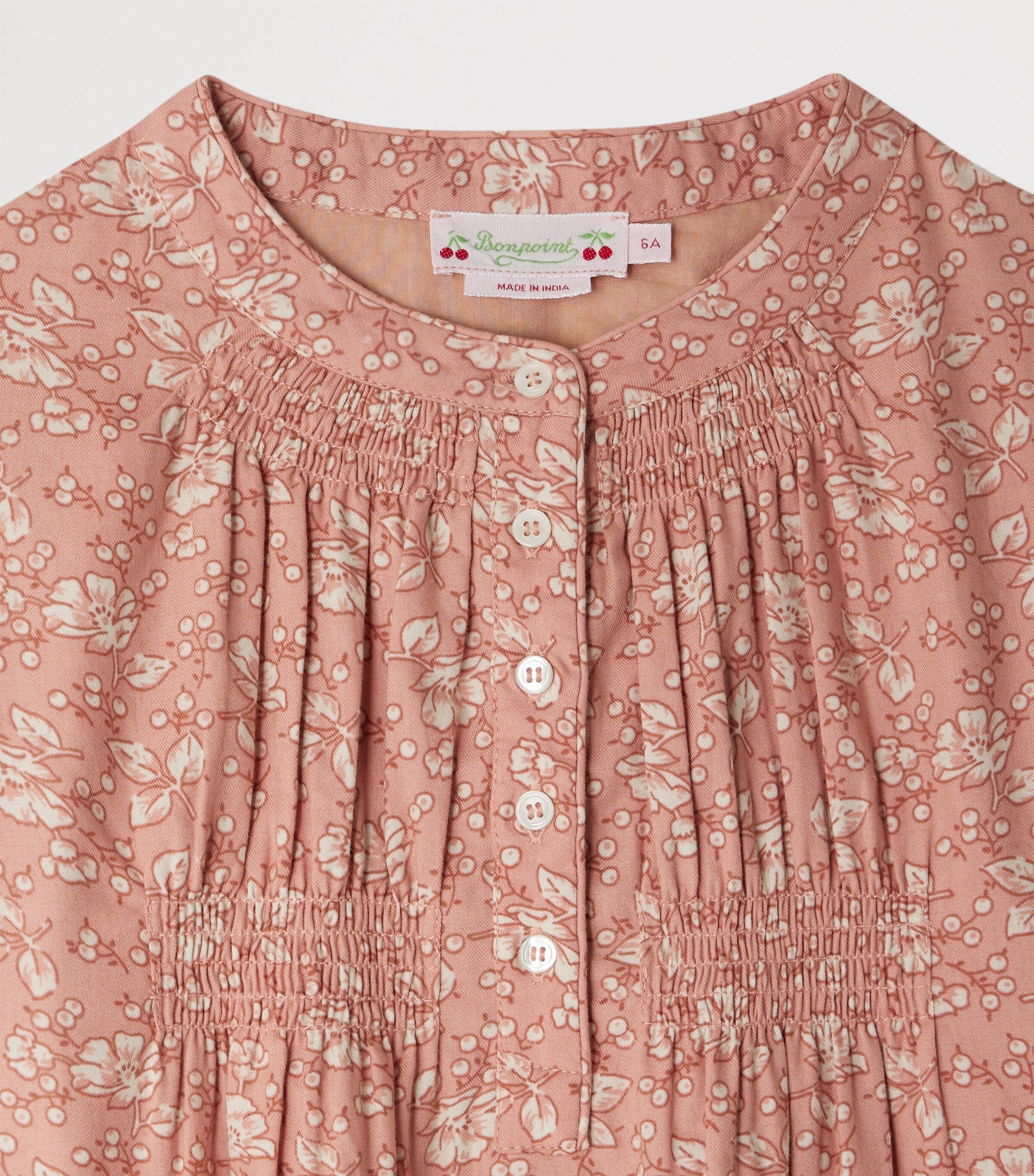 Bonpoint’s organic cotton Tania dress is cut from certified organic cotton twill for comfortable all-day wear, its two-tone botanical print introducing gentle colour and depth. Smocking and gathers at the shoulders, neckline and bust add delicate structure, while mother-of-pearl cuffs and a button placket below the collar finish the straight-cut silhouette.