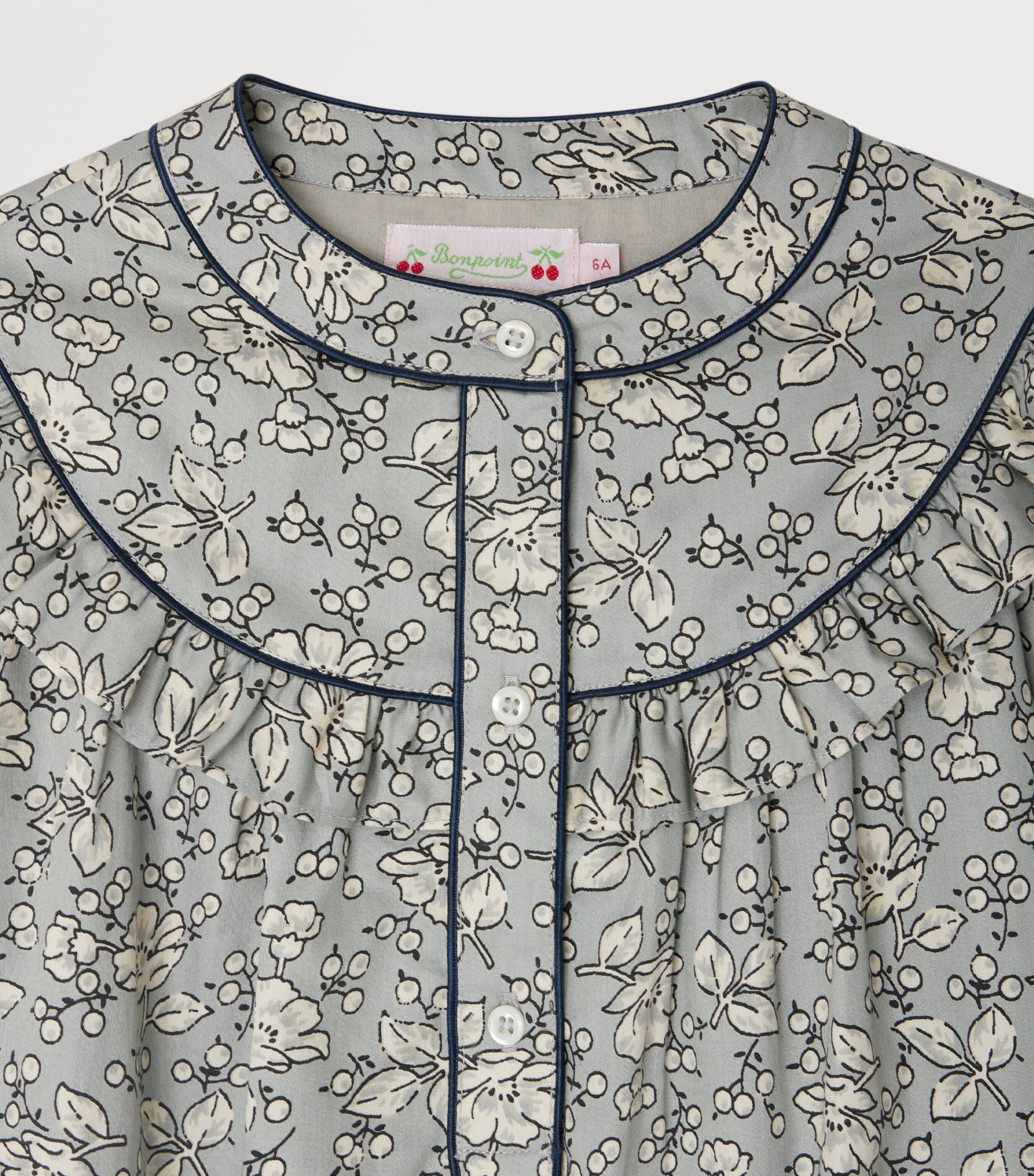 Bonpoint’s Jacinta dress celebrates delicate florals across organic cotton, its ruffled yoke adding soft structure to the chest and back. Subtle gathers animate the long sleeves, while a solid-coloured border frames the neckline, cuffs and button placket for a polished, wearable charm.