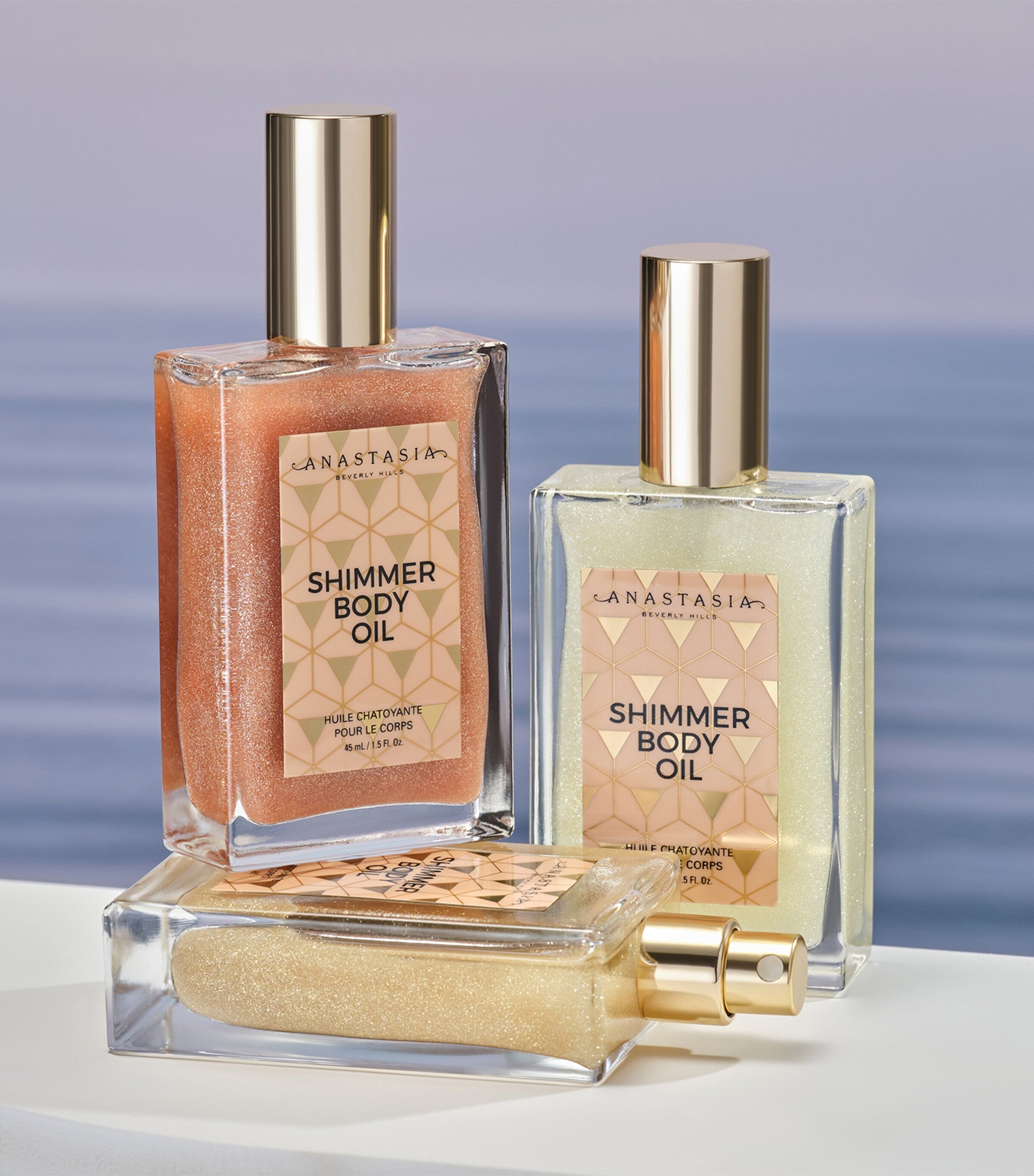 Fully immerse yourself in the essence of summer with Anastasia Beverly Hills’ Shimmer Body Oil. One spritz of the super-fine mist illuminates the skin with a glittering, sun-kissed golden glow, while the lightweight formula – infused with antioxidant-rich jojoba seed oil and sweet almond oil – leaves behind a soft touch and irresistible coconut-vanilla fragrance.