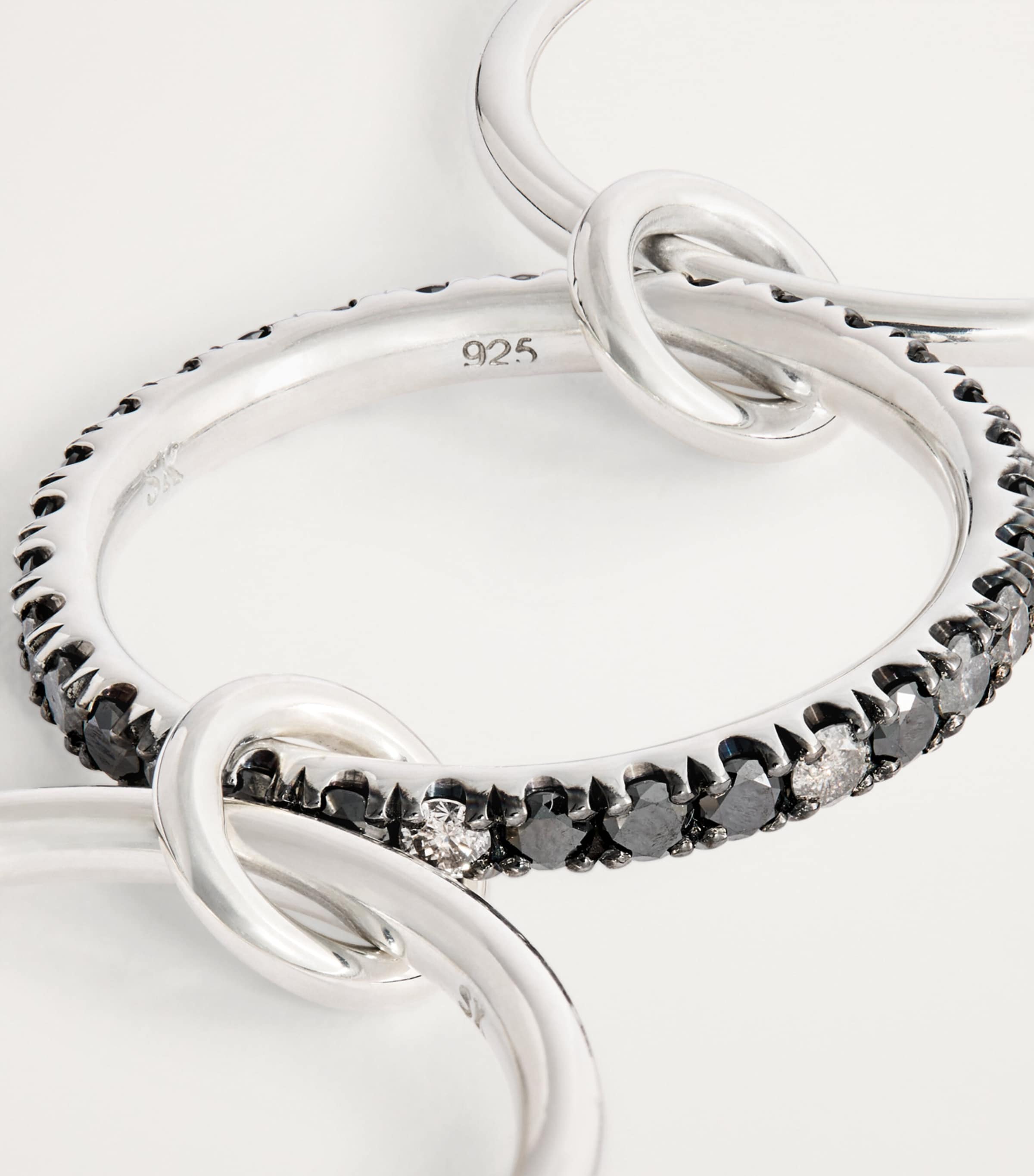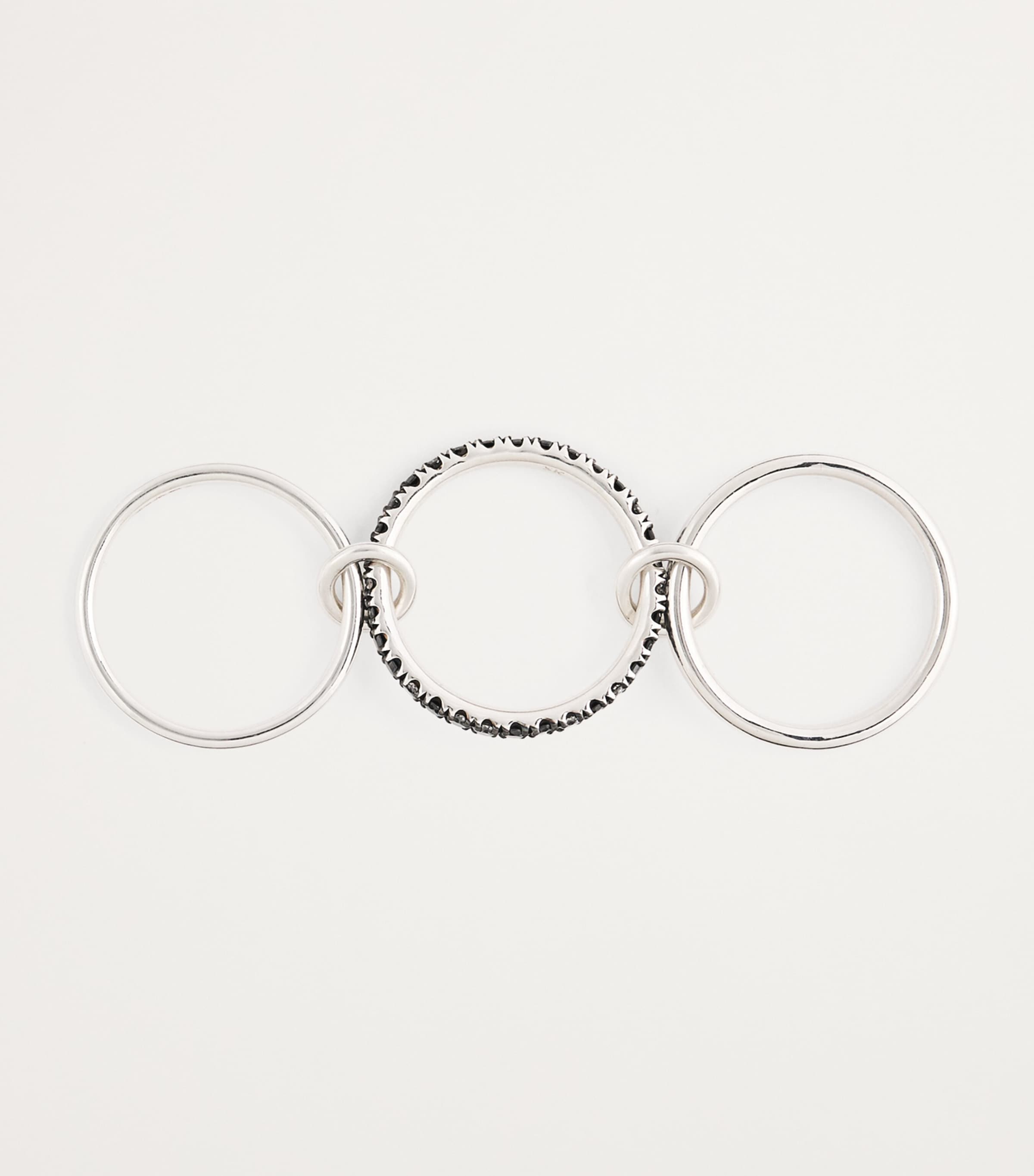 Handcrafted by artisans in downtown Los Angeles, every Spinelli Kilcollin jewellery design is a treat for the eyes. Sticking to the status quo, this ring frames a grey and black u-pavé diamond-encrusted band with a pair of sterling silver renditions, before linking the trio with two orbiting connectors.