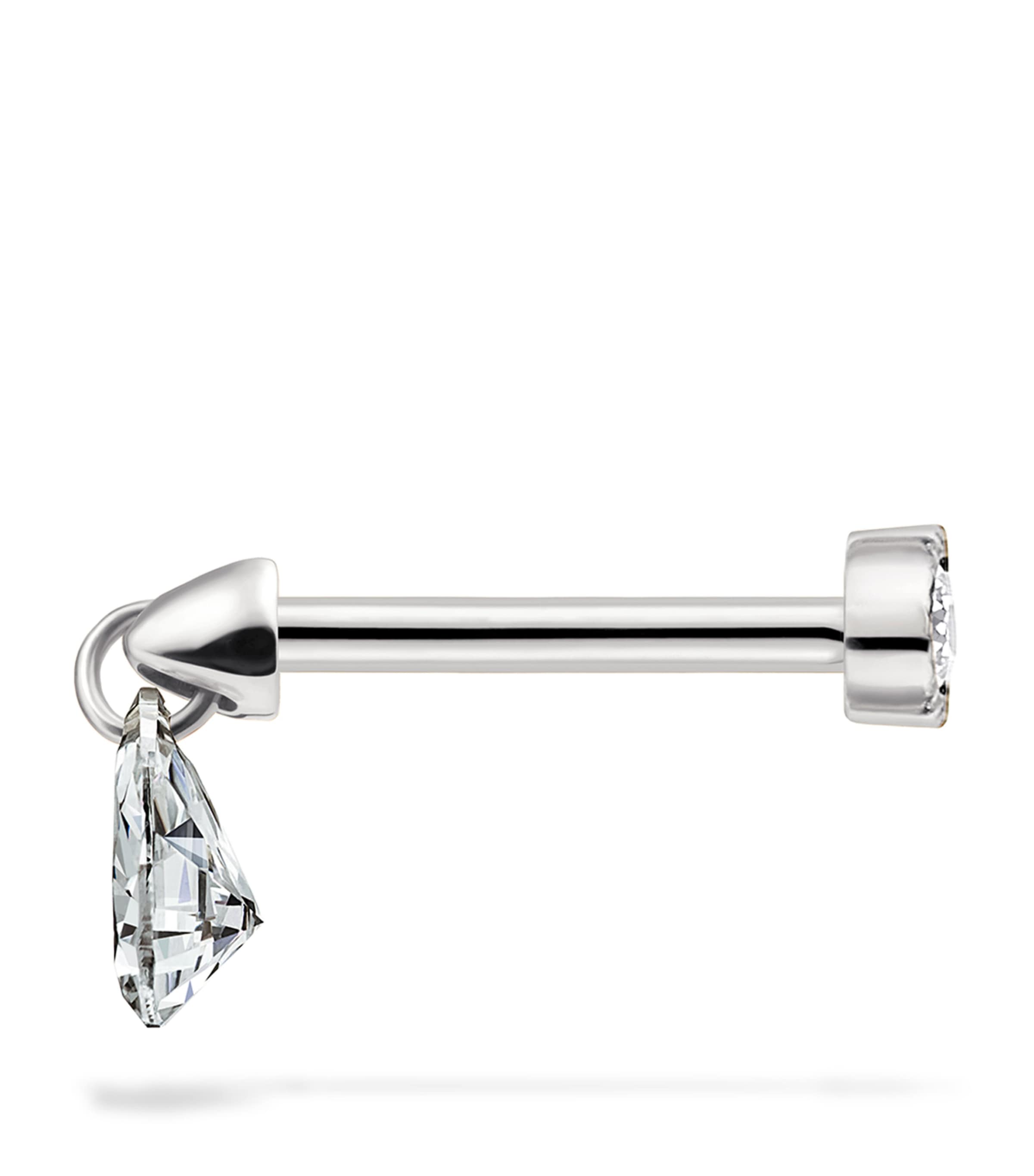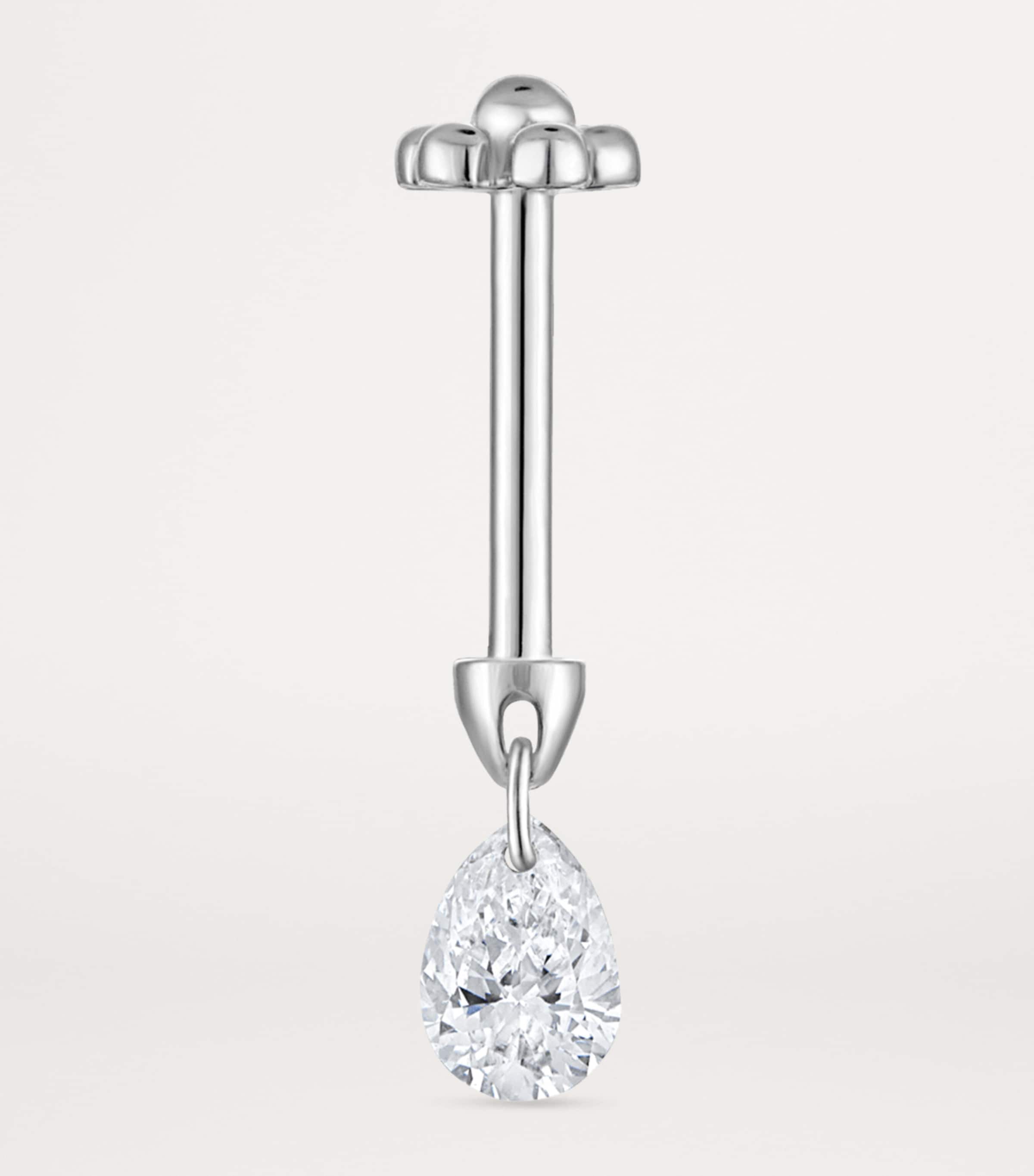 Piercings specialist MARIA TASH’s threaded studs are highly coveted for those seeking jewellery that’s a little less ordinary. Here, a single earring takes a minimalist direction, with an arrow-shaped barbell in gleaming white gold hosting a daintily dangling pear-shaped diamond that delivers the illusion of floating, while to the back, an additional diamond sits like a glimmering secret.For threaded studs, post sizing other than 6.5mm can be requested through Customer Service.