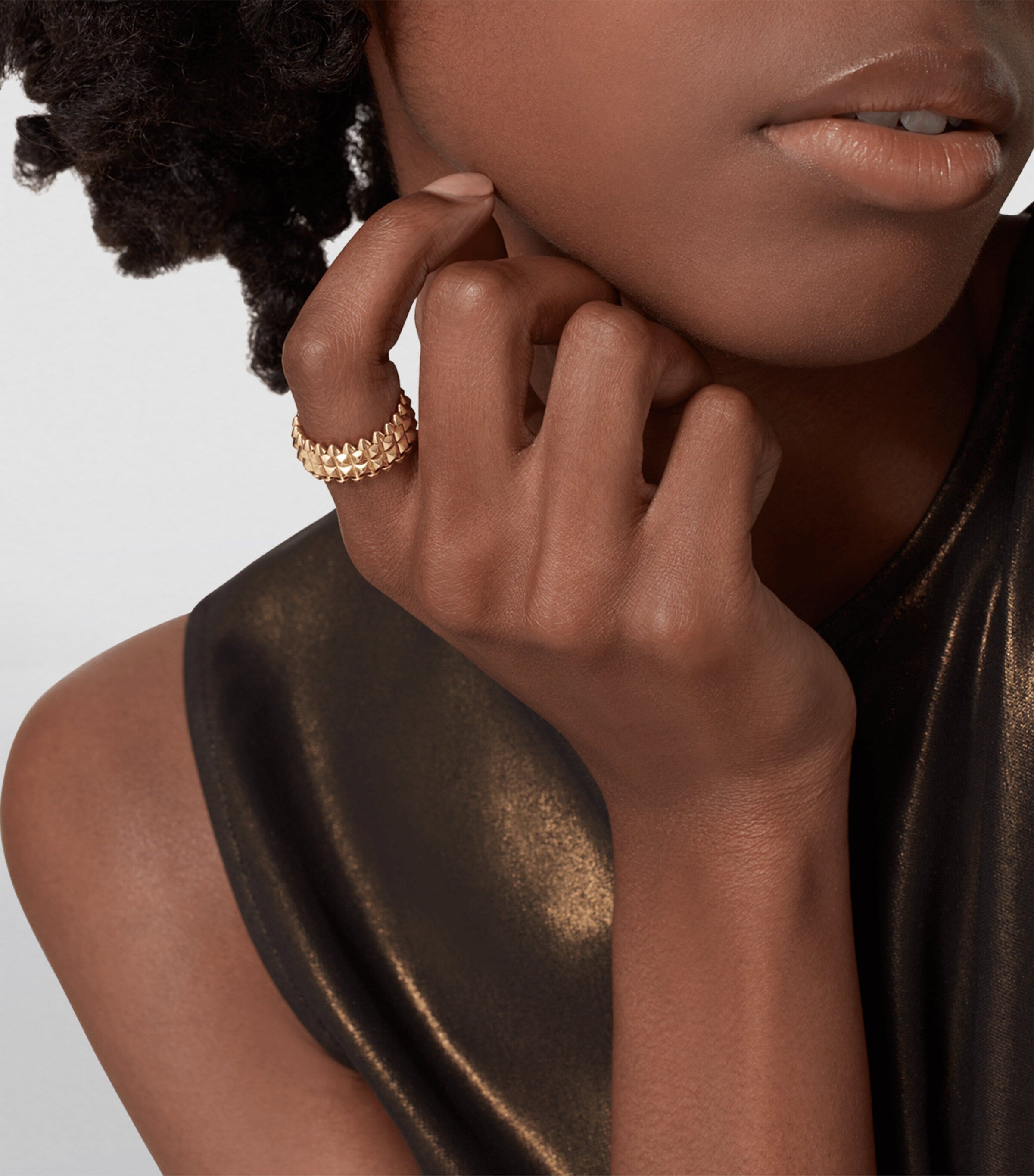 Embodying both harmony and duality, the Clash de Cartier collection celebrates the concept of opposing forces. The studs of this yellow gold double-row ring appear sharp but are soft to the touch and reflect light as if they aren't fixed in place yet. With soft contours that extend to the delicately scalloped underside for comfortable wear, it boasts an underlying architectural tautness for a result that will keep you guessing.