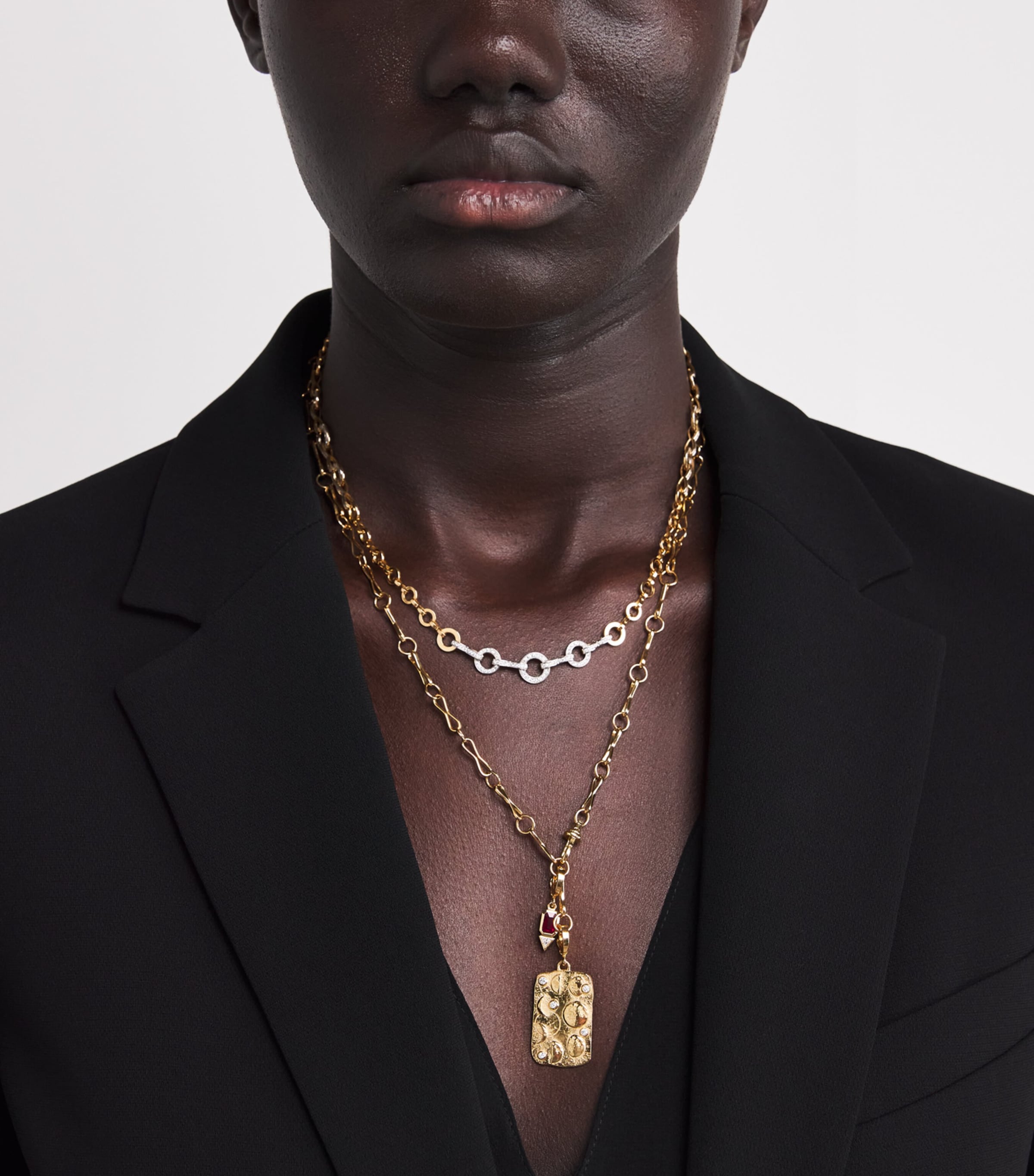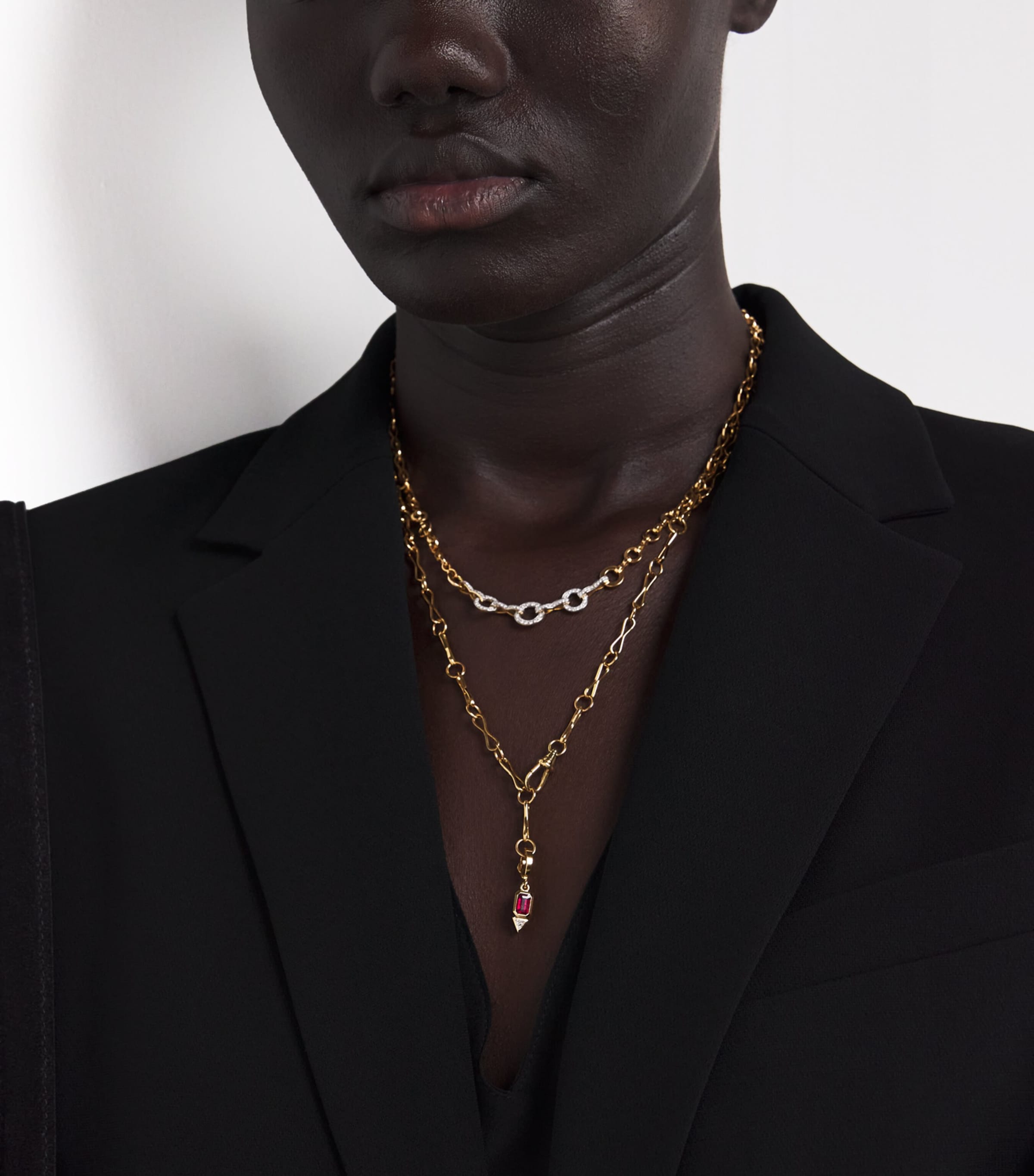 The founder of Azlee, Baylee Ann Zwart, is an expert in diamond cuts, so each new collection comes with the thrill of what will be included: will it be a clean row of baguettes or a crowning princess? With this 18-karat yellow gold July charm, a singular trillion is cast as the supporting role alongside a larger ruby – it’s safe to say that the results speak for themselves.