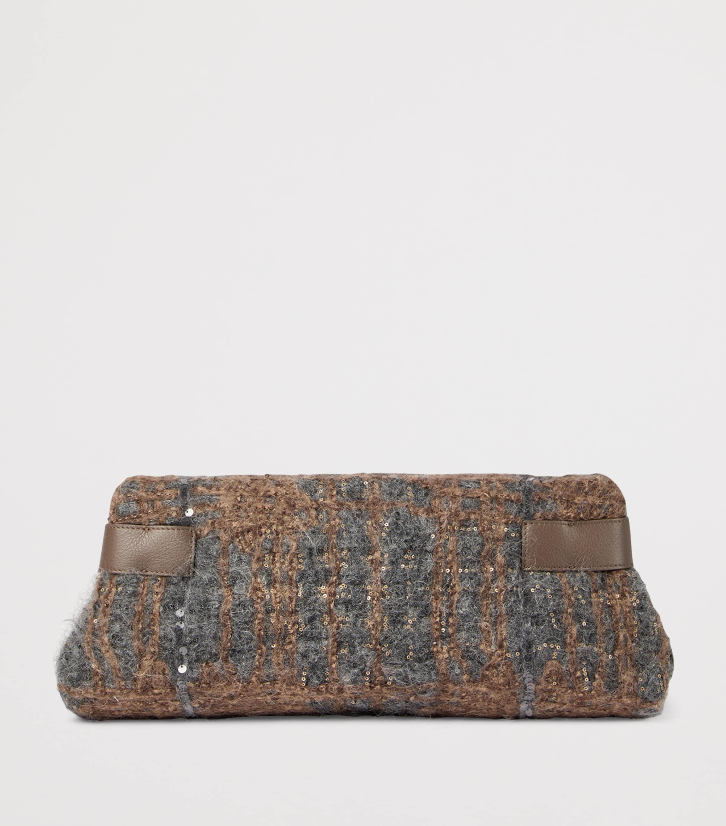 Brunello Cucinelli blurs the line between knitwear and accessories. Well-known for its inclusion of sparkling, nickel-free monili beads throughout its collections, Brunello Cucinelli takes a different approach when it comes to the Essence clutch bag. The mohair, alpaca and wool body – cleverly woven to represent an eclectic take on the historic Prince of Wales check – is subtly accented with clear sequins for a playful sign-off.