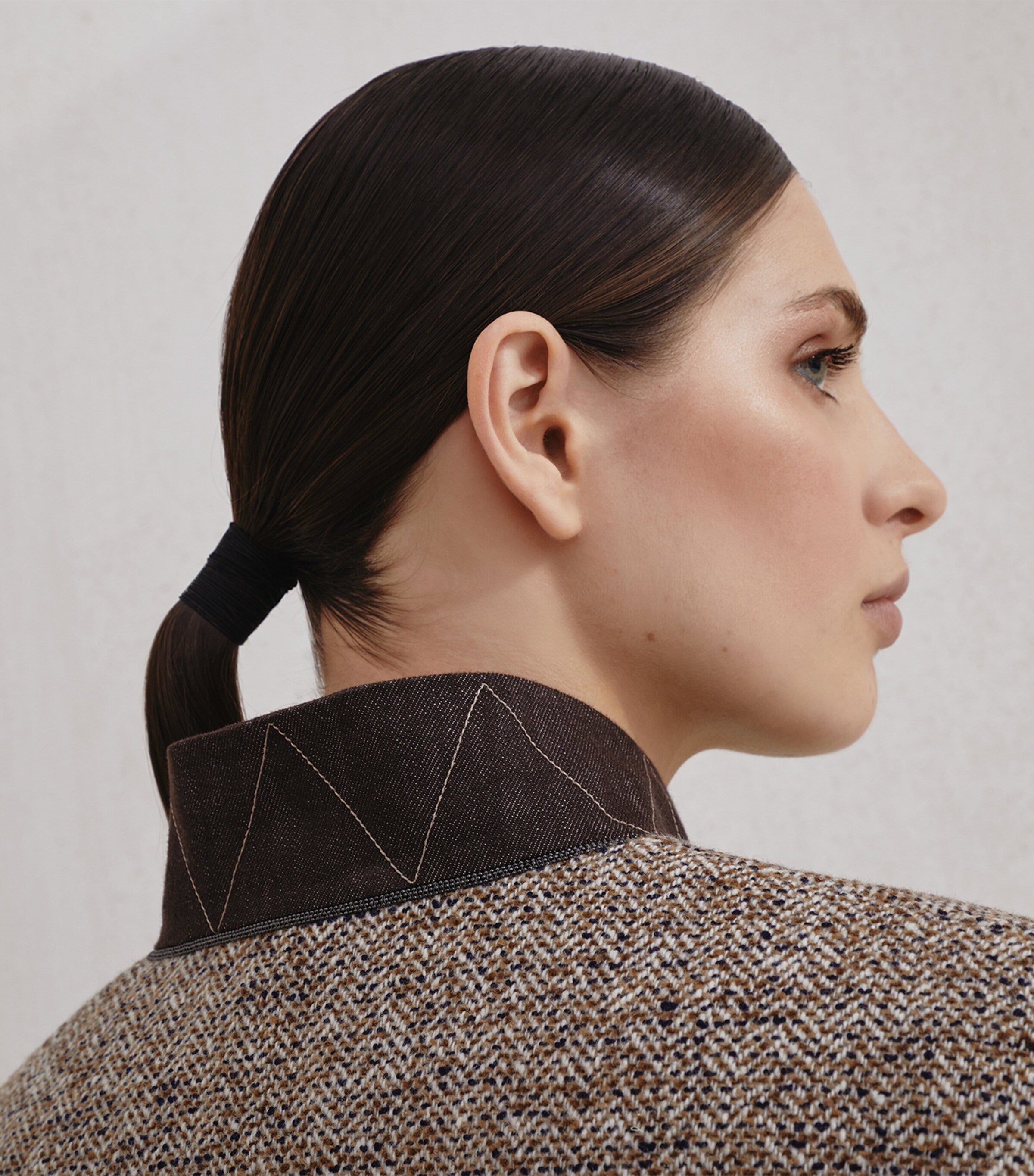 A contrasting bomber-style collar creates a refined interplay between modernity and timelessness.