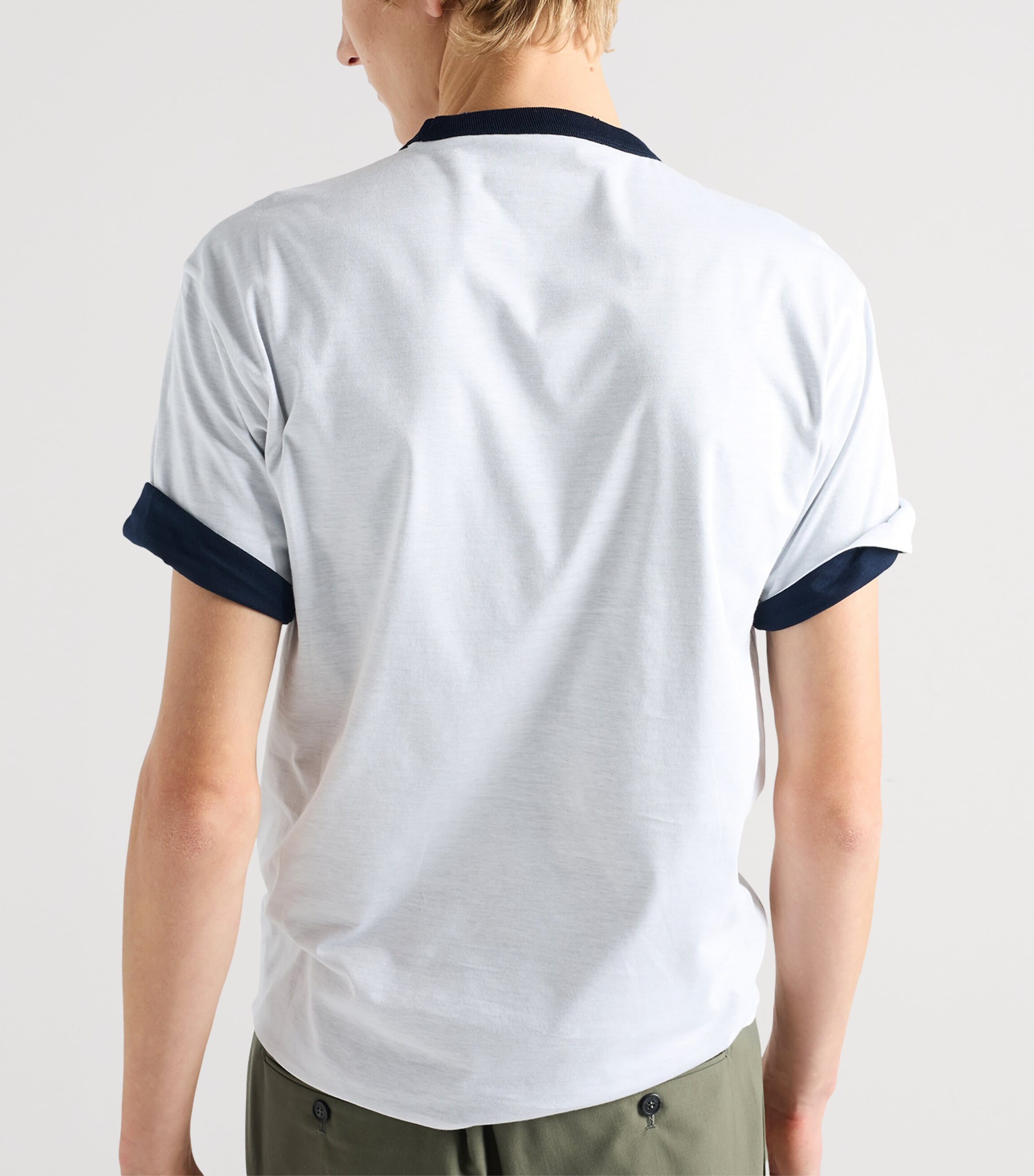 Prada has long explored utilitarian aspects within its collections, from its famed Re-Nylon fabric to the unmistakeable sport edge of the '90s line Prada Sport. Here, it introduces unexpected depth to a classic cotton T-shirt with a reversible contrasting lining, allowing you to effortlessly flip from minimal navy blue to a white base with contrasting navy trims and a logo-detailed patch pocket.