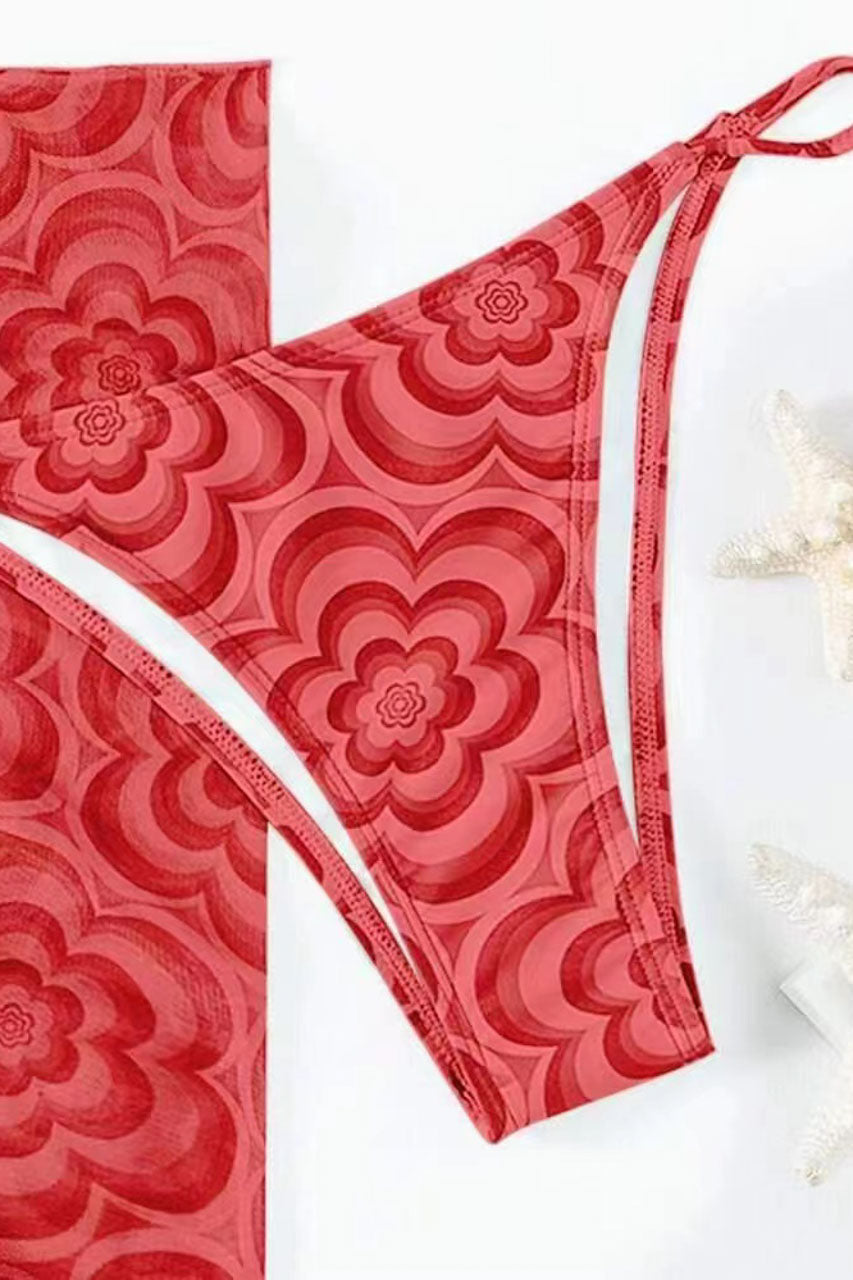 Make a splash in this memorable Red and Ready Bikini! Featuring a red floral design, triangle top, cheeky bottom, and wrap skirt, you'll be looking fierce and feeling fabulous. Show off at the beach and add some extra flavor to your summer wardrobe!