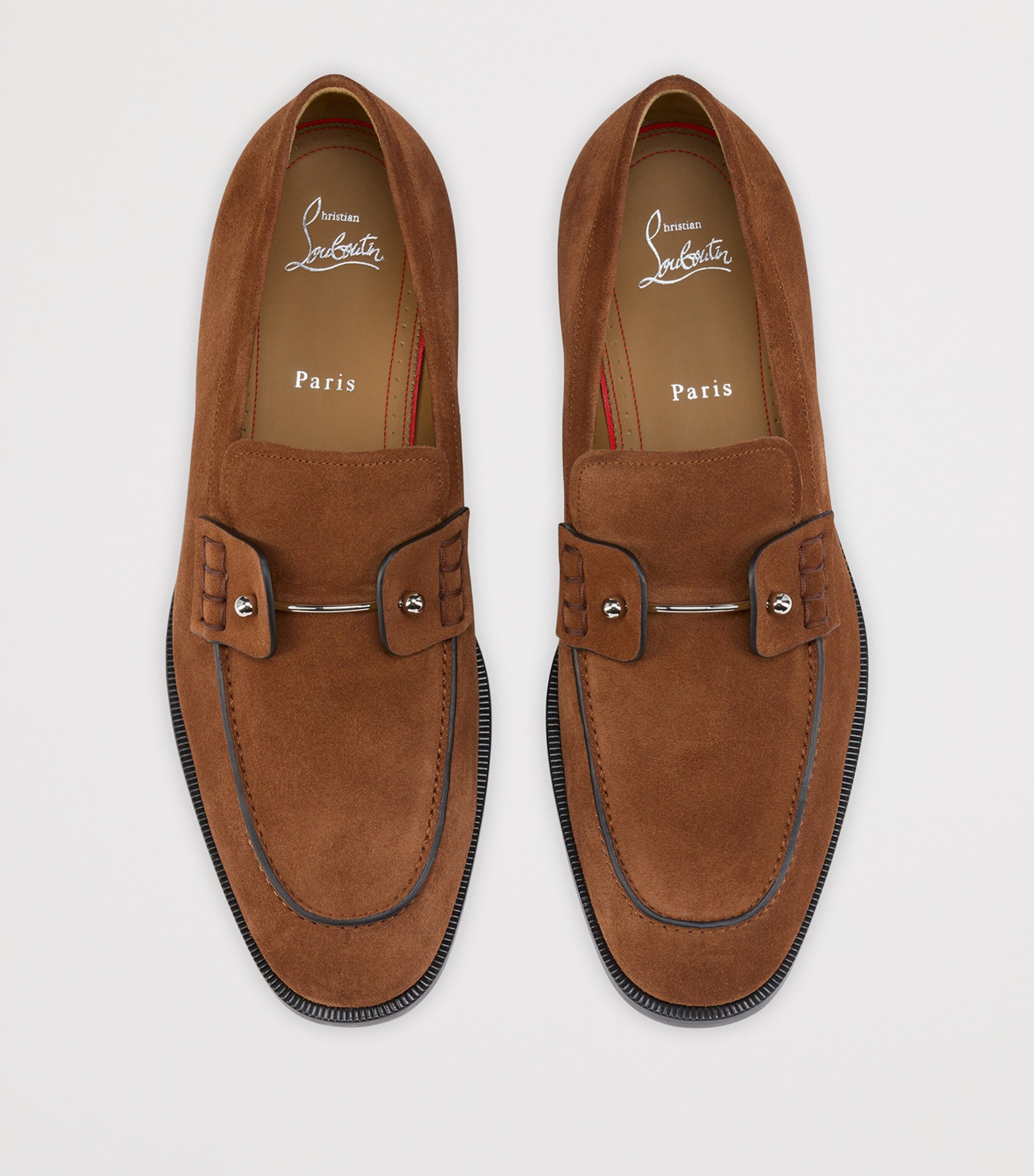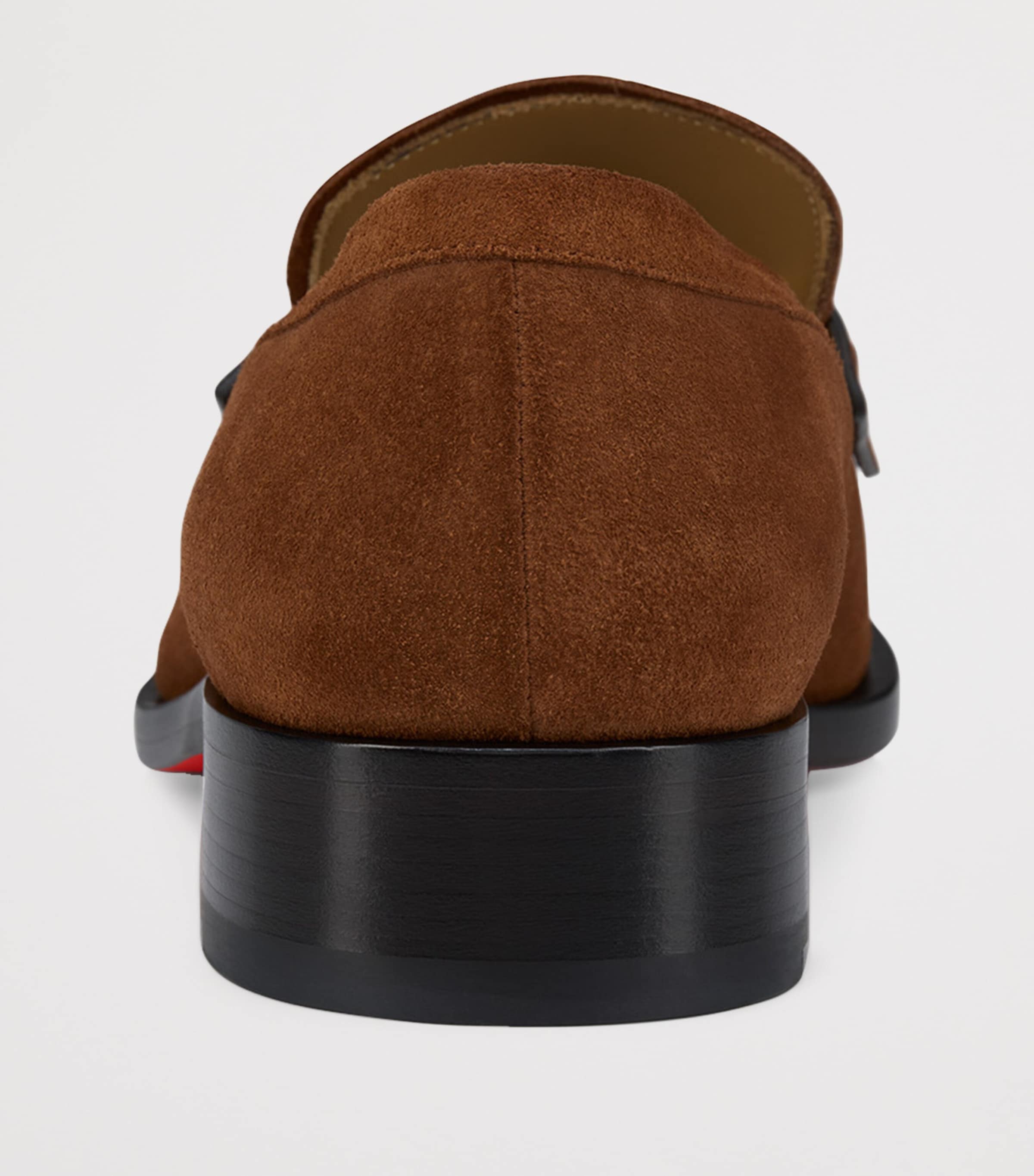 After remarking on an employee’s scarlet nail polish, Christian Louboutin had the idea for his most fabulous finish: the lacquered red soles that are now an iconic symbol in footwear. The Chambelimoc loafers are blessed with this detail, complementing the style's suede upper and metal collar pin.