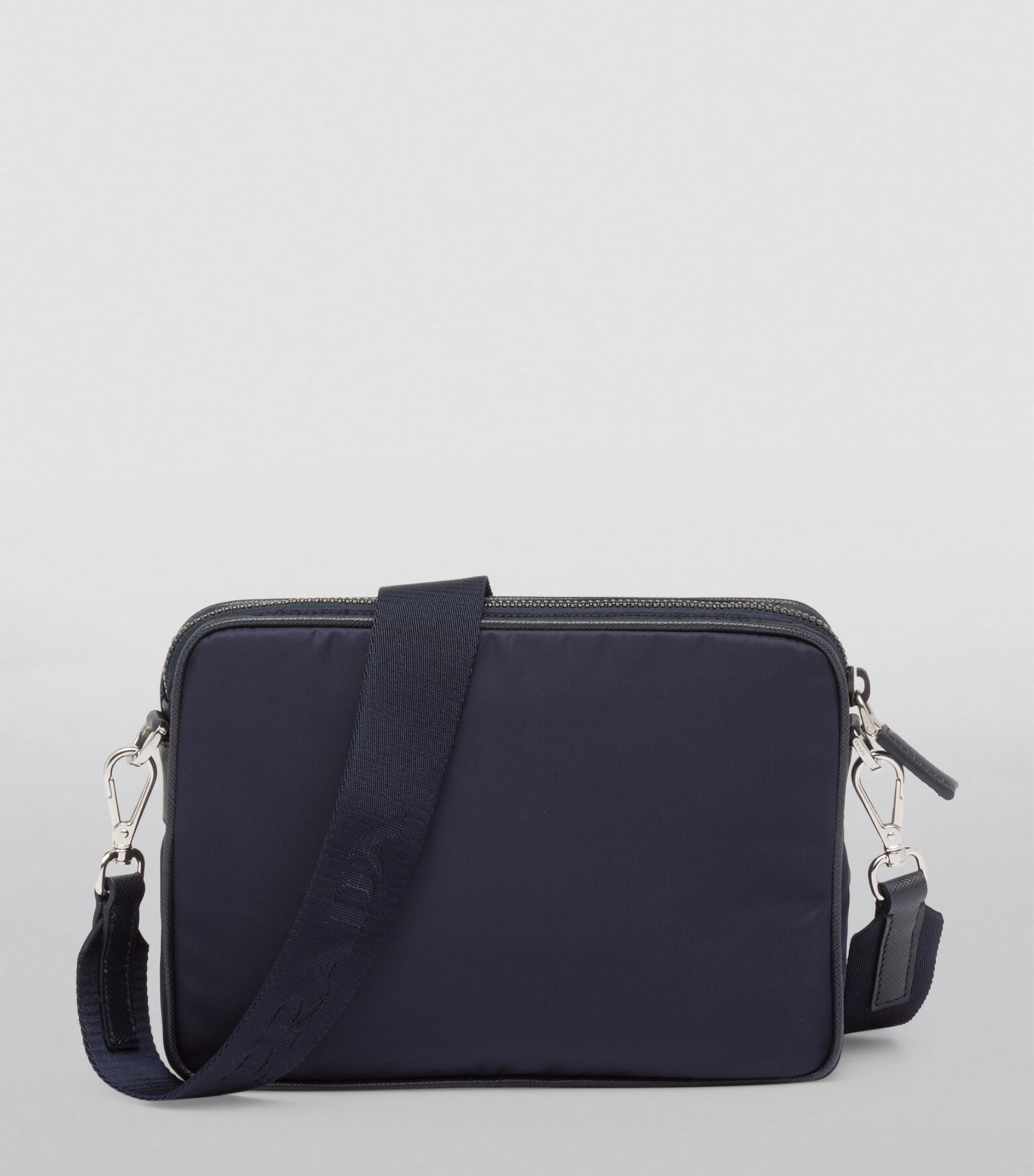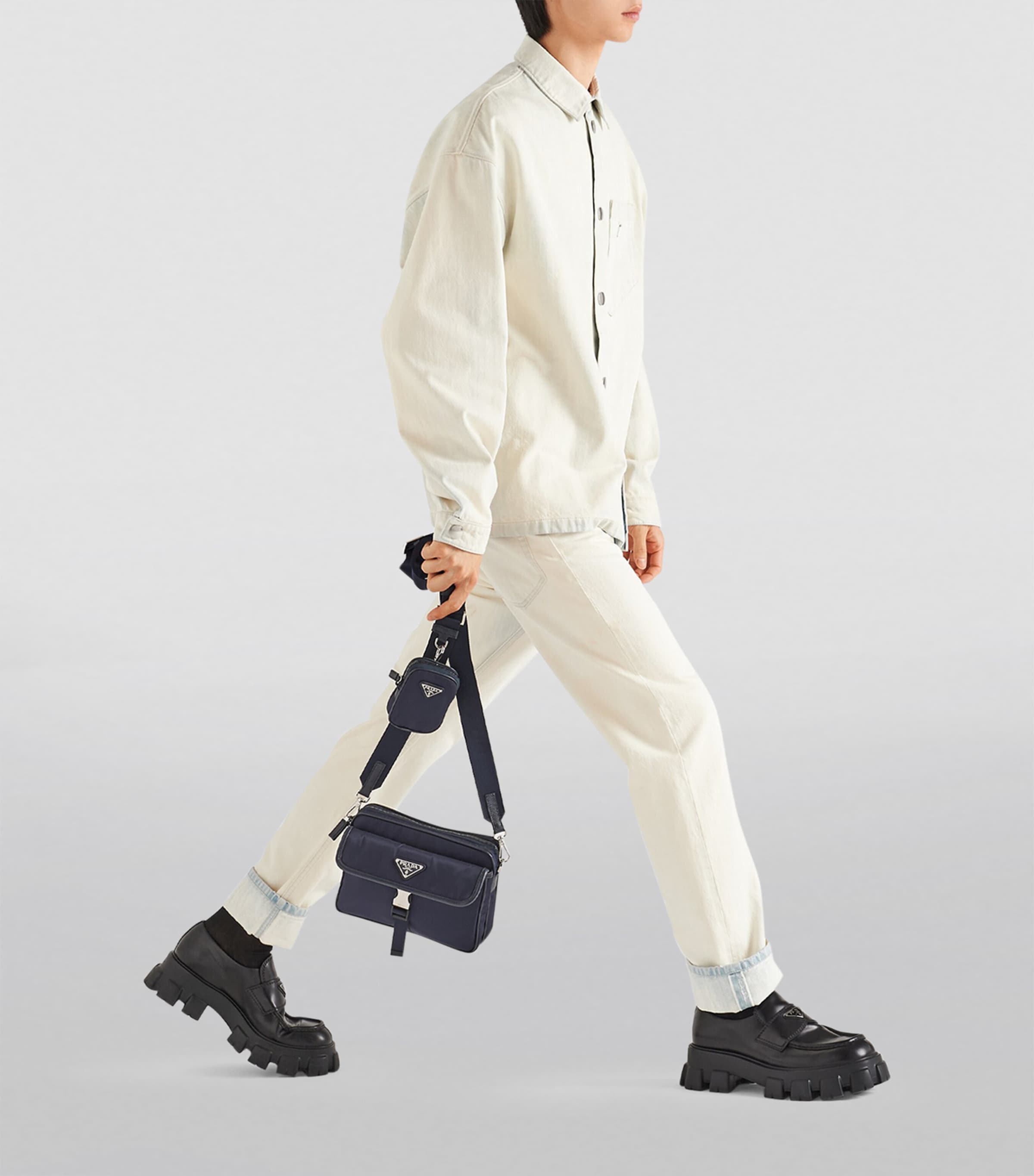 The detachable pouch to the strap is a Prada signature. Utilitarianism with a luxurious flair is the Prada way. Crafted from the Italian House’s signature Re-Nylon – a fabric produced from recycled waste found in the ocean – and finished with smooth Saffiano leather trims, this boxy shoulder bag speaks to the label’s dedication to blending innovation with heritage.