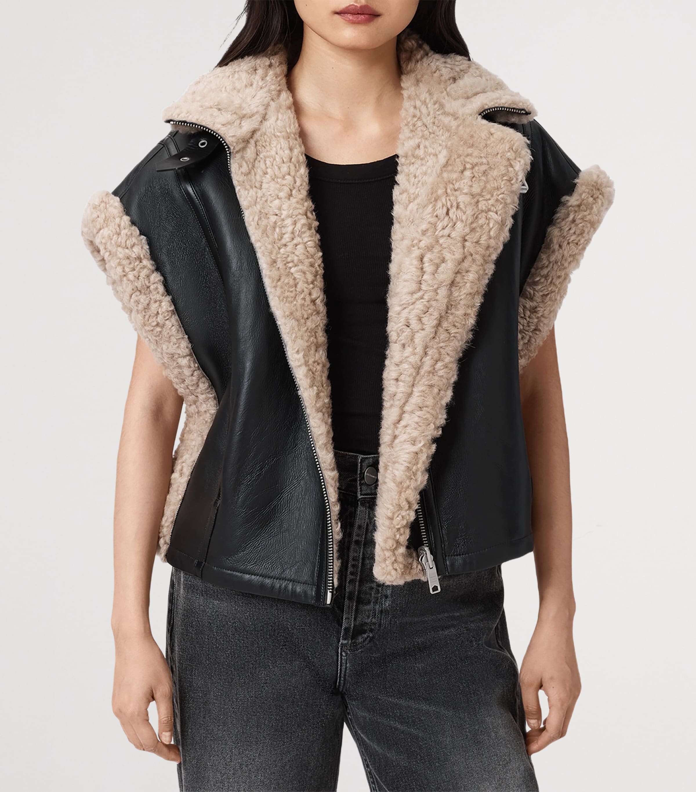 AllSaints Black Reversible Shearling Marlin Gilet - black/natural / XS