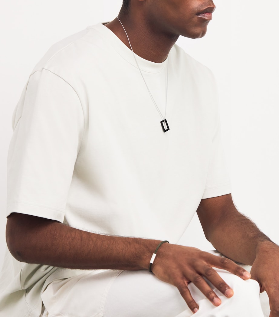 While le gramme’s name is coined from the weight of its jewellery, its designs are heavily informed by industrial architecture and the Bauhaus movement. This polished ceramic necklace is no exception, featuring a slender chain and an angular rectangle pendant that lends a striking detail to plain T-shirts and sweaters.