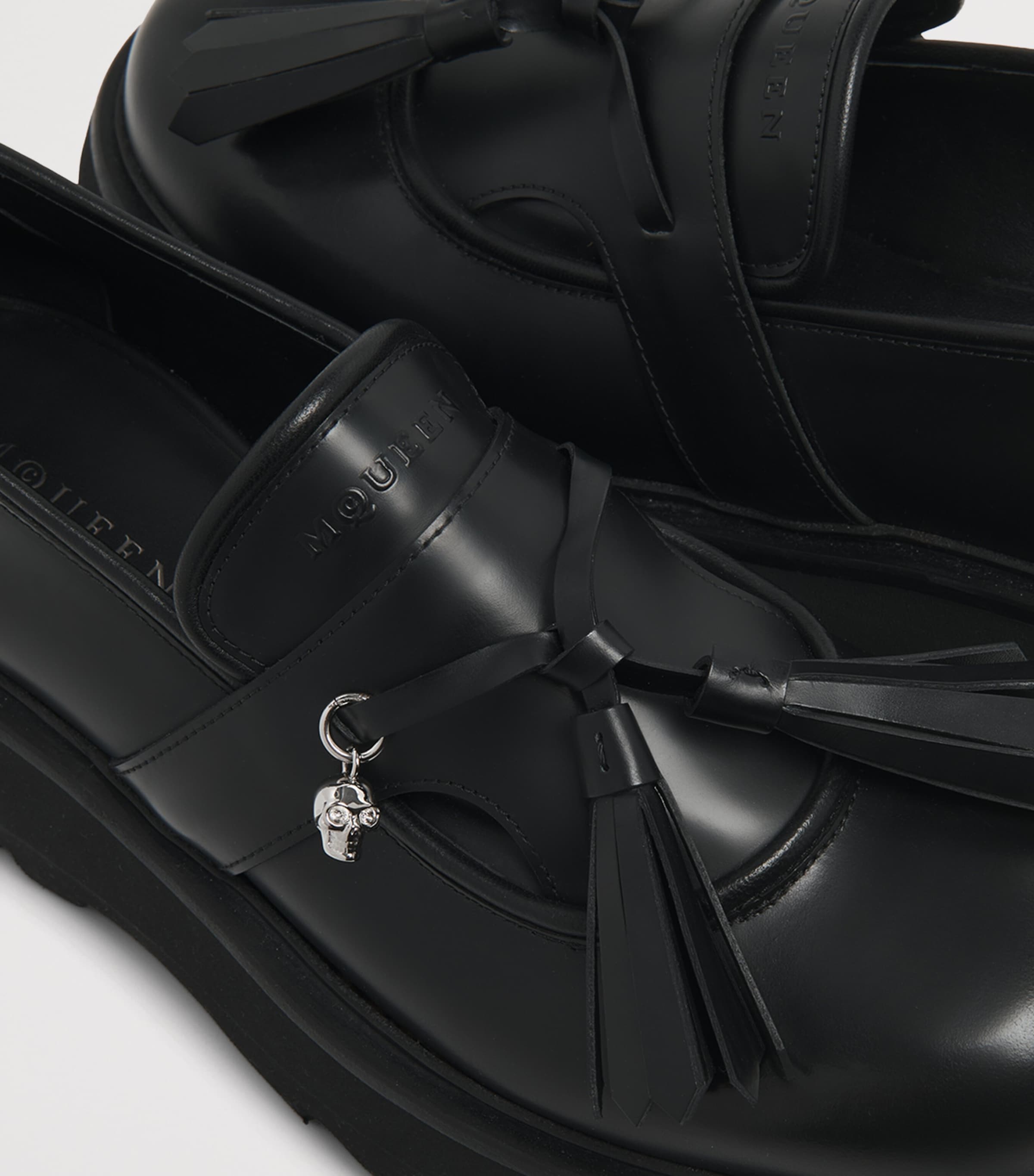 Rooted in the House’s long-standing love of exaggerated footwear, McQueen’s Sofa loafers reinterpret a timeless silhouette through a bolder, sculptural lens. Smooth leather forms the clean upper, finished with double tassels that whisper to classic menswear, while the flatform sole speaks far louder – a modern continuation of the brand’s famous 1990s experimentations with outsized shoes.
