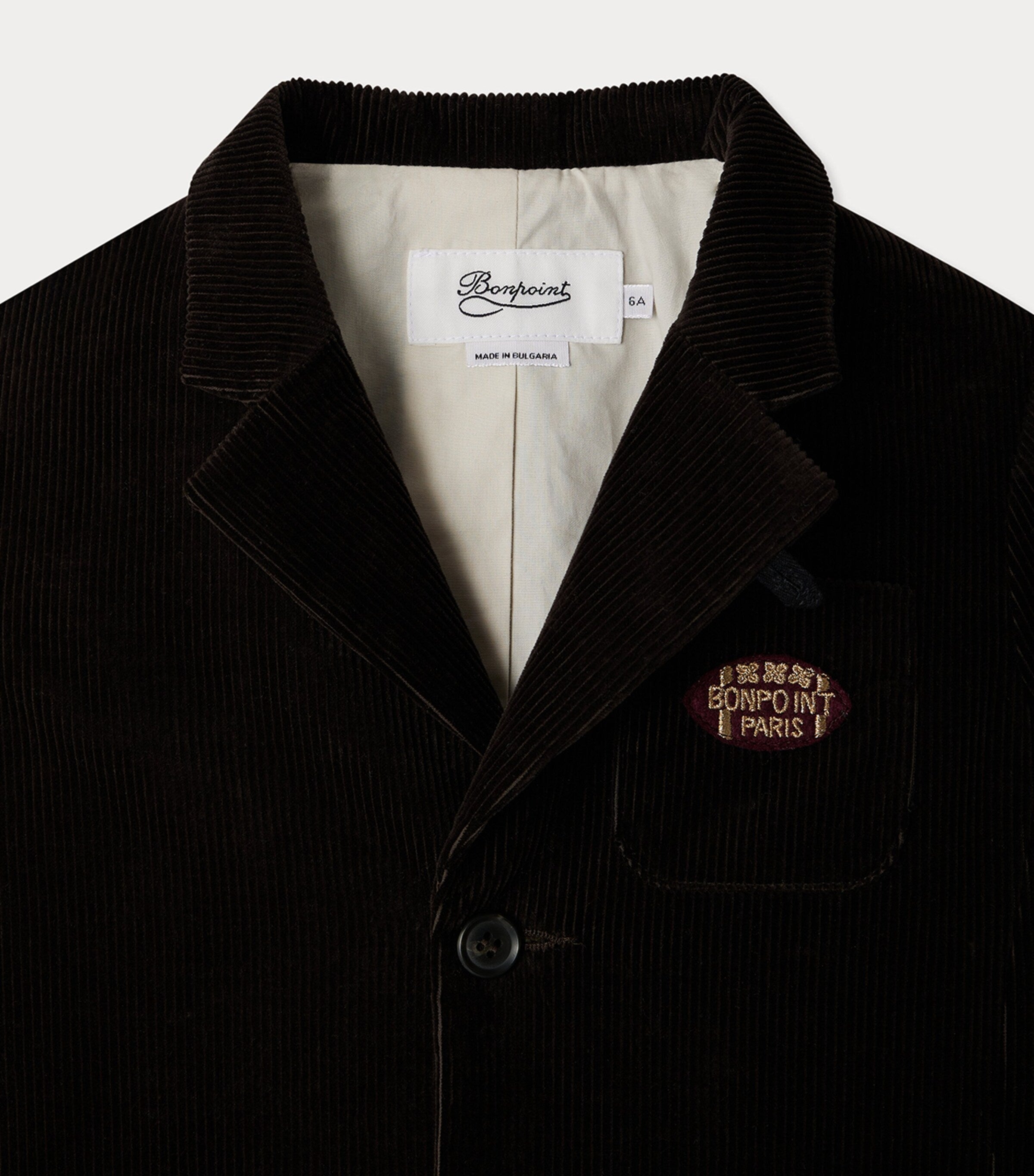 Bonpoint’s Teo blazer uses certified organic cotton velvet to produce a plush surface that reads refined without excess; the button fastening secures a simple silhouette designed for effortless formality. Buttoned cuffs and a straight cut give structure while the striped lining introduces a discreet burst of personality when sleeves are turned up.