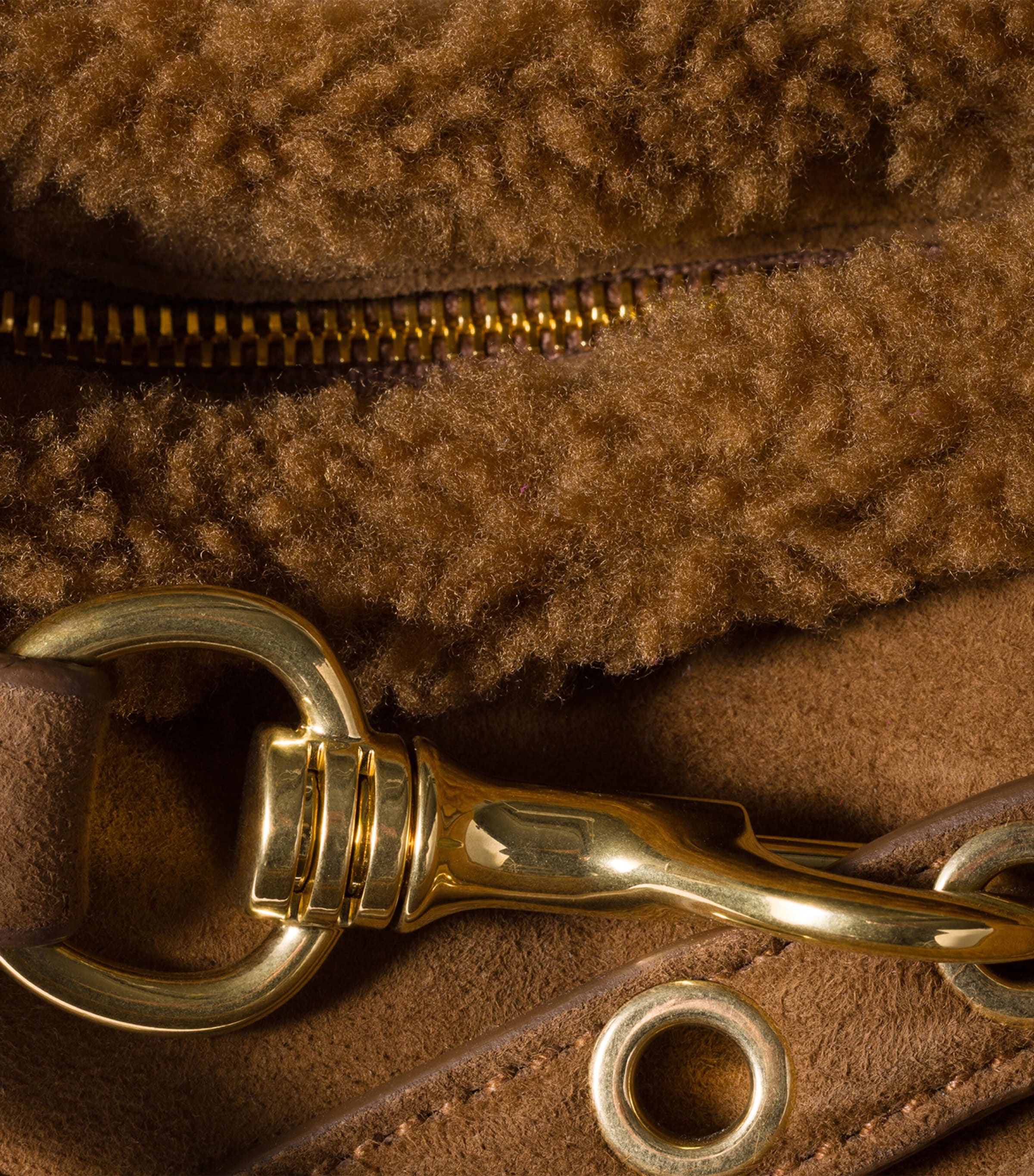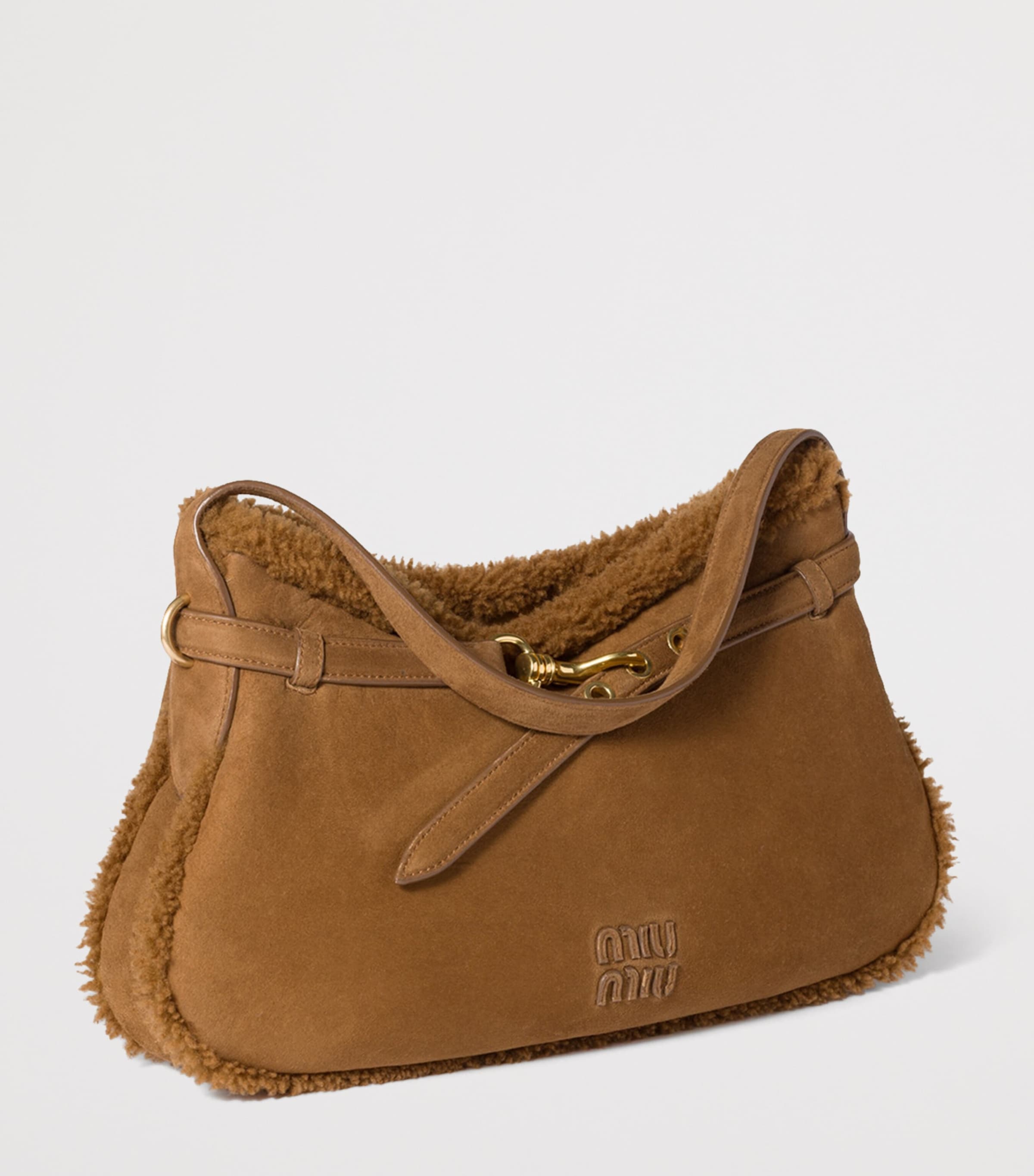 A silhouette taken from Miu Miu’s archives, the Aventure shoulder bag is a vintage-inspired style with modern practicality. Boasting a practical size for day-to-day errands and evening adventures, it has been crafted in smooth suede and lined with shearling for a masterclass in textural intrigue.